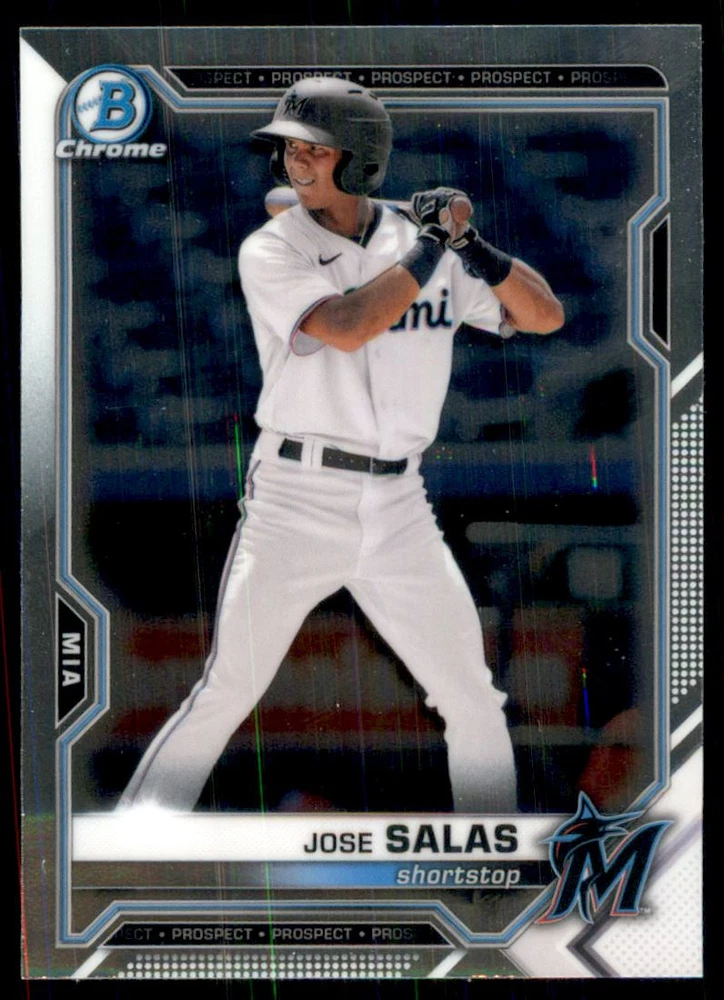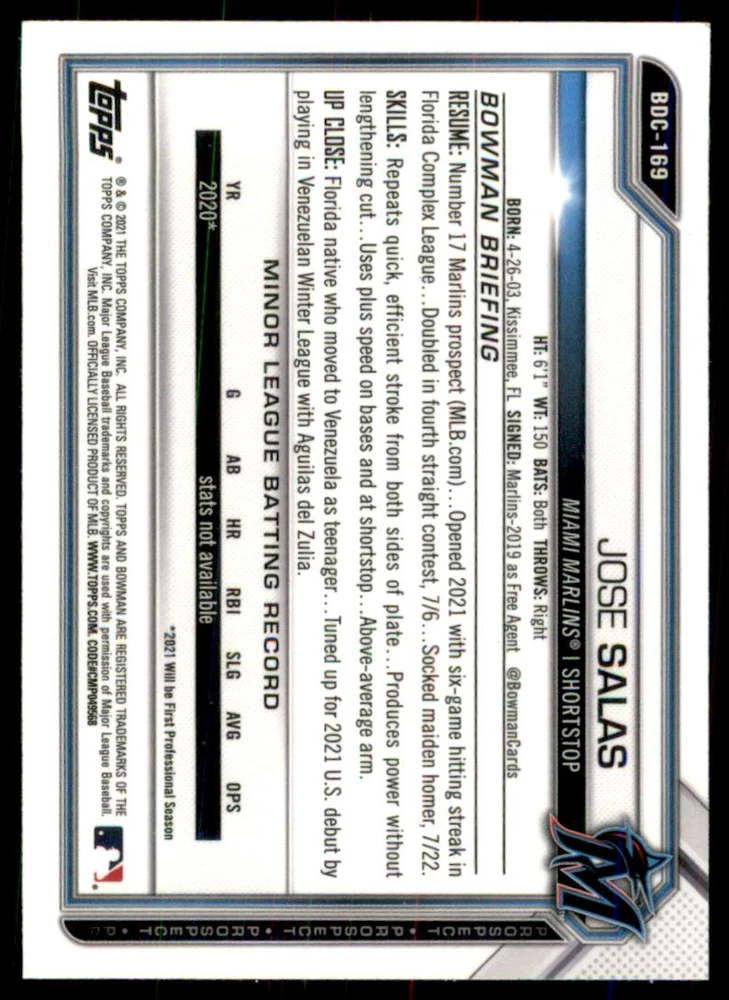 2021 Bowman Chrome Draft #BDC169 Jose Salas Front Back Sport: Baseball Set: 2021 Bowman Chrome Draft Year: 2021 Item#: BDC169 Player: Jose Salas Team: Miami Marlins Brand: Bowman Draft Manufacturer: Topps Co. Grading Company: Raw Grade SetType: Main Item Condition: Near Mint/Mint 2014 Beckett Collectibles, LLC. All Rights Reserved Powered by: Thank you for choosing Burbank Sportscards, the sports cards superstore. We offer a large selection of singles across all sports. Visit our ebay store to view all our items available. Our Shipping Policy We offer Free Standard Shipping to all Domestic customers. Options for Expedited shipping are also available at checkout. For our international customers, shipping is $9.99 for the first item, and $0.25 for each additional item. Note to all customers: To qualify for combines shipping, we ask our customers to add items into the shopping cart. Please note, we do not combine orders that are placed separately. Our Service: Generally, our turnaround is super quick as we process and send out orders same day payment is received. Stock Availability: We do our best to ensure all items are in stock; however, in case of the rare stock out, the customer will have the option for a replacement card, or we will process a refund so the order is not held up. Our Images: Many of our images are stock photos from Beckett archives. They are a representation of the actual card you would receive. If you have any questions regarding the item you're interested in, please feel free to ask (serial numbers and relic pieces may vary) Moreover, in a case of a wrong or defective photo, please notify us, so we can adjust it. Other FAQ's: -When buying multiple cards, do you top load each item? No; however, we do try to insure all items are shipped securely. If you wish to have all of your cards top loaded it is a paid service and can be arranged. Please email for more details. For other questions, please feel free to ask. Thank you.