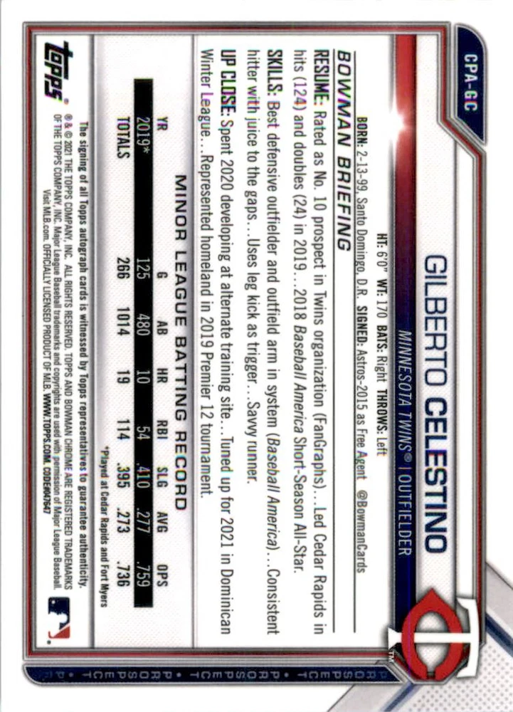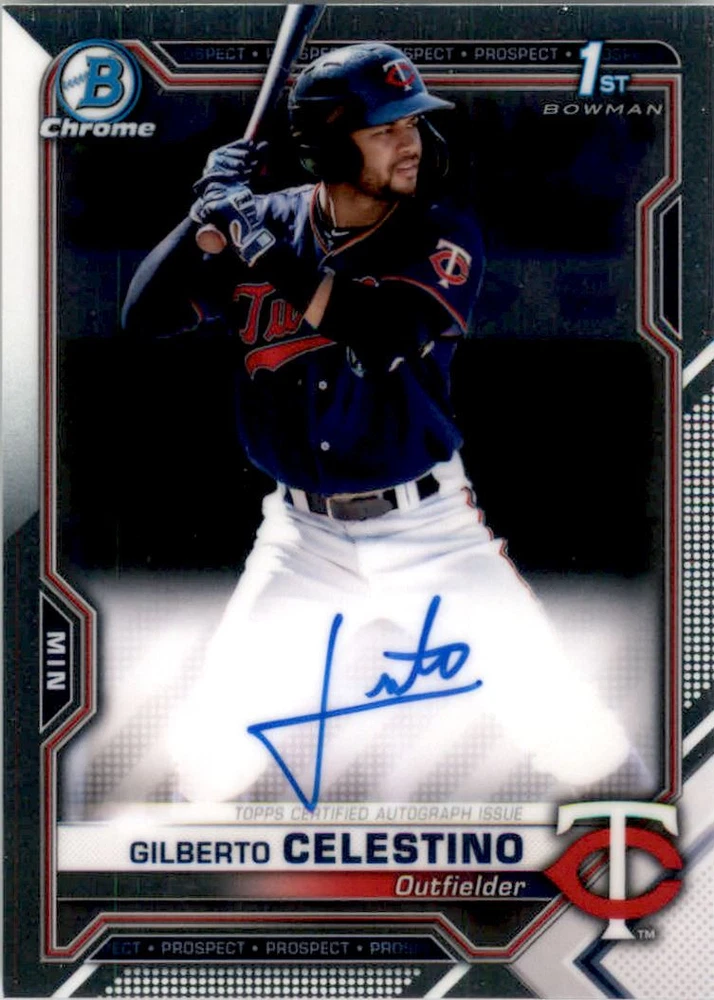 2021 Bowman Chrome Prospect Autographs #CPAGC Gilberto Celestino Front Back Sport: Baseball Set: 2021 Bowman Chrome Prospect Autographs Year: 2021 Item#: CPAGC Player: Gilberto Celestino Team: Minnesota Twins Attributes: Autograph Brand: Bowman Chrome Manufacturer: Topps Co. Grading Company: Raw Grade SetType: Insert Item Condition: Near Mint/Mint 2014 Beckett Collectibles, LLC. All Rights Reserved Powered by: Thank you for choosing Burbank Sportscards, the sports cards superstore. We offer a large selection of singles across all sports. Visit our ebay store to view all our items available. Our Shipping Policy We offer Free Standard Shipping to all Domestic customers. Options for Expedited shipping are also available at checkout. For our international customers, shipping is $9.99 for the first item, and $0.25 for each additional item. Note to all customers: To qualify for combines shipping, we ask our customers to add items into the shopping cart. Please note, we do not combine orders that are placed separately. Our Service: Generally, our turnaround is super quick as we process and send out orders same day payment is received. Stock Availability: We do our best to ensure all items are in stock; however, in case of the rare stock out, the customer will have the option for a replacement card, or we will process a refund so the order is not held up. Our Images: Many of our images are stock photos from Beckett archives. They are a representation of the actual card you would receive. If you have any questions regarding the item you're interested in, please feel free to ask (serial numbers and relic pieces may vary) Moreover, in a case of a wrong or defective photo, please notify us, so we can adjust it. Other FAQ's: -When buying multiple cards, do you top load each item? No; however, we do try to insure all items are shipped securely. If you wish to have all of your cards top loaded it is a paid service and can be arranged. Please email for more details. For other questions, please feel free to ask. Thank you.