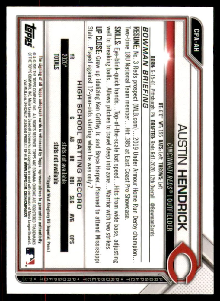 2021 Bowman Chrome Prospect Autographs Cincinnati Reds #CPAAH Austin Hendrick Front Back Sport: Baseball Set: 2021 Bowman Chrome Prospect Autographs Year: 2021 Item#: CPAAH Player: Austin Hendrick Team: Cincinnati Reds Attributes: Autograph Brand: Bowman Chrome Manufacturer: Topps Co. Grading Company: Raw Grade SetType: Insert Item Condition: Near Mint/Mint 2014 Beckett Collectibles, LLC. All Rights Reserved Powered by: Thank you for choosing Burbank Sportscards, the sports cards superstore. We offer a large selection of singles across all sports. Visit our ebay store to view all our items available. Our Shipping Policy We offer Free Standard Shipping to all Domestic customers. Options for Expedited shipping are also available at checkout. For our international customers, shipping is $9.99 for the first item, and $0.25 for each additional item. Note to all customers: To qualify for combines shipping, we ask our customers to add items into the shopping cart. Please note, we do not combine orders that are placed separately. Our Service: Generally, our turnaround is super quick as we process and send out orders same day payment is received. Stock Availability: We do our best to ensure all items are in stock; however, in case of the rare stock out, the customer will have the option for a replacement card, or we will process a refund so the order is not held up. Our Images: Many of our images are stock photos from Beckett archives. They are a representation of the actual card you would receive. If you have any questions regarding the item you're interested in, please feel free to ask (serial numbers and relic pieces may vary) Moreover, in a case of a wrong or defective photo, please notify us, so we can adjust it. Other FAQ's: -When buying multiple cards, do you top load each item? No; however, we do try to insure all items are shipped securely. If you wish to have all of your cards top loaded it is a paid service and can be arranged. Please email for more details. For other questions, please feel free to ask. Thank you.