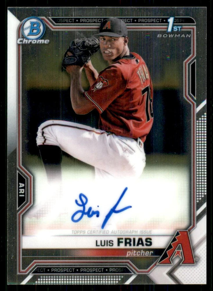 2021 Bowman Chrome Prospect Autographs Diamondbacks #CPALF Luis Frias Front Back Sport: Baseball Set: 2021 Bowman Chrome Prospect Autographs Year: 2021 Item#: CPALF Player: Luis Frias Team: Arizona Diamondbacks Attributes: Autograph Brand: Bowman Chrome Manufacturer: Topps Co. Grading Company: Raw Grade SetType: Insert Item Condition: Near Mint/Mint 2014 Beckett Collectibles, LLC. All Rights Reserved Powered by: Thank you for choosing Burbank Sportscards, the sports cards superstore. We offer a large selection of singles across all sports. Visit our ebay store to view all our items available. Our Shipping Policy We offer Free Standard Shipping to all Domestic customers. Options for Expedited shipping are also available at checkout. For our international customers, shipping is $9.99 for the first item, and $0.25 for each additional item. Note to all customers: To qualify for combines shipping, we ask our customers to add items into the shopping cart. Please note, we do not combine orders that are placed separately. Our Service: Generally, our turnaround is super quick as we process and send out orders same day payment is received. Stock Availability: We do our best to ensure all items are in stock; however, in case of the rare stock out, the customer will have the option for a replacement card, or we will process a refund so the order is not held up. Our Images: Many of our images are stock photos from Beckett archives. They are a representation of the actual card you would receive. If you have any questions regarding the item you're interested in, please feel free to ask (serial numbers and relic pieces may vary) Moreover, in a case of a wrong or defective photo, please notify us, so we can adjust it. Other FAQ's: -When buying multiple cards, do you top load each item? No; however, we do try to insure all items are shipped securely. If you wish to have all of your cards top loaded it is a paid service and can be arranged. Please email for more details. For other questions, please feel free to ask. Thank you.