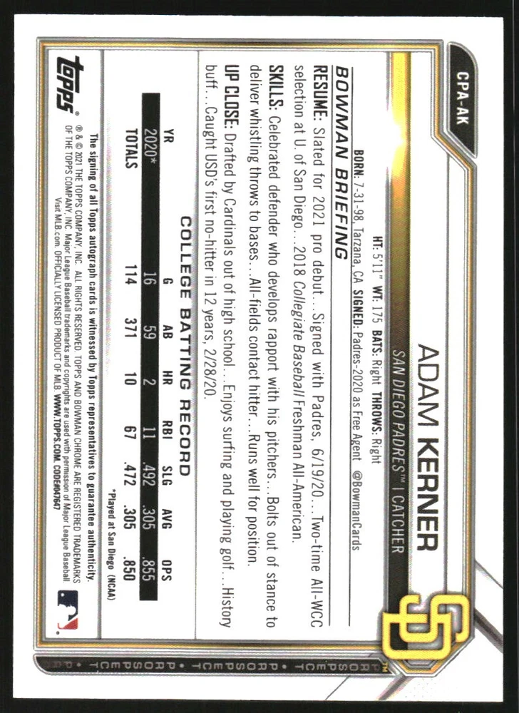2021 Bowman Chrome Prospect Autographs Green Atomic Refs #CPAAK Adam Kerner /99 Front Back Sport: Baseball Set: 2021 Bowman Chrome Prospect Autographs Green Atomic Refractors Year: 2021 Item#: CPAAK Player: Adam Kerner Team: San Diego Padres Attributes: Autograph, Serial Numbered Brand: Bowman Chrome Manufacturer: Topps Co. Grading Company: Raw Grade SetType: Parallel Insert Item Condition: Near Mint/Mint 2014 Beckett Collectibles, LLC. All Rights Reserved Powered by: Thank you for choosing Burbank Sportscards, the sports cards superstore. We offer a large selection of singles across all sports. Visit our ebay store to view all our items available. Our Shipping Policy We offer Free Standard Shipping to all Domestic customers. Options for Expedited shipping are also available at checkout. For our international customers, shipping is $9.99 for the first item, and $0.25 for each additional item. Note to all customers: To qualify for combines shipping, we ask our customers to add items into the shopping cart. Please note, we do not combine orders that are placed separately. Our Service: Generally, our turnaround is super quick as we process and send out orders same day payment is received. Stock Availability: We do our best to ensure all items are in stock; however, in case of the rare stock out, the customer will have the option for a replacement card, or we will process a refund so the order is not held up. Our Images: Many of our images are stock photos from Beckett archives. They are a representation of the actual card you would receive. If you have any questions regarding the item you're interested in, please feel free to ask (serial numbers and relic pieces may vary) Moreover, in a case of a wrong or defective photo, please notify us, so we can adjust it. Other FAQ's: -When buying multiple cards, do you top load each item? No; however, we do try to insure all items are shipped securely. If you wish to have all of your cards top loaded it is a paid service and can be arranged. Please email for more details. For other questions, please feel free to ask. Thank you.