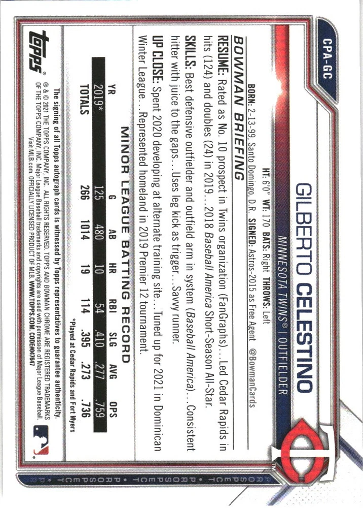 2021 Bowman Chrome Prospect Autographs Purple Ref #CPAGC Gilberto Celestino /250 Front Back Sport: Baseball Set: 2021 Bowman Chrome Prospect Autographs Purple Refractors Year: 2021 Item#: CPAGC Player: Gilberto Celestino Team: Minnesota Twins Attributes: Autograph, Serial Numbered Brand: Bowman Chrome Manufacturer: Topps Co. Grading Company: Raw Grade SetType: Parallel Insert Item Condition: Near Mint/Mint 2014 Beckett Collectibles, LLC. All Rights Reserved Powered by: Thank you for choosing Burbank Sportscards, the sports cards superstore. We offer a large selection of singles across all sports. Visit our ebay store to view all our items available. Our Shipping Policy We offer Free Standard Shipping to all Domestic customers. Options for Expedited shipping are also available at checkout. For our international customers, shipping is $9.99 for the first item, and $0.25 for each additional item. Note to all customers: To qualify for combines shipping, we ask our customers to add items into the shopping cart. Please note, we do not combine orders that are placed separately. Our Service: Generally, our turnaround is super quick as we process and send out orders same day payment is received. Stock Availability: We do our best to ensure all items are in stock; however, in case of the rare stock out, the customer will have the option for a replacement card, or we will process a refund so the order is not held up. Our Images: Many of our images are stock photos from Beckett archives. They are a representation of the actual card you would receive. If you have any questions regarding the item you're interested in, please feel free to ask (serial numbers and relic pieces may vary) Moreover, in a case of a wrong or defective photo, please notify us, so we can adjust it. Other FAQ's: -When buying multiple cards, do you top load each item? No; however, we do try to insure all items are shipped securely. If you wish to have all of your cards top loaded it is a paid service and can be arranged. Please email for more details. For other questions, please feel free to ask. Thank you.