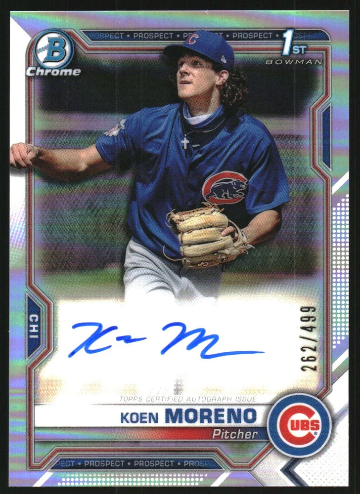 2021 Bowman Chrome Prospect Autographs Refractors #CPAKMO Koen Moreno /499 Front Back Sport: Baseball Set: 2021 Bowman Chrome Prospect Autographs Refractors Year: 2021 Item#: CPAKMO Player: Koen Moreno Team: Chicago Cubs Attributes: Autograph, Serial Numbered Brand: Bowman Chrome Manufacturer: Topps Co. Grading Company: Raw Grade SetType: Parallel Insert Item Condition: Near Mint/Mint 2014 Beckett Collectibles, LLC. All Rights Reserved Powered by: Thank you for choosing Burbank Sportscards, the sports cards superstore. We offer a large selection of singles across all sports. Visit our ebay store to view all our items available. Our Shipping Policy We offer Free Standard Shipping to all Domestic customers. Options for Expedited shipping are also available at checkout. For our international customers, shipping is $9.99 for the first item, and $0.25 for each additional item. Note to all customers: To qualify for combines shipping, we ask our customers to add items into the shopping cart. Please note, we do not combine orders that are placed separately. Our Service: Generally, our turnaround is super quick as we process and send out orders same day payment is received. Stock Availability: We do our best to ensure all items are in stock; however, in case of the rare stock out, the customer will have the option for a replacement card, or we will process a refund so the order is not held up. Our Images: Many of our images are stock photos from Beckett archives. They are a representation of the actual card you would receive. If you have any questions regarding the item you're interested in, please feel free to ask (serial numbers and relic pieces may vary) Moreover, in a case of a wrong or defective photo, please notify us, so we can adjust it. Other FAQ's: -When buying multiple cards, do you top load each item? No; however, we do try to insure all items are shipped securely. If you wish to have all of your cards top loaded it is a paid service and can be arranged. Please email for more details. For other questions, please feel free to ask. Thank you.