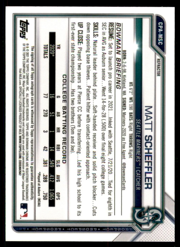 2021 Bowman Chrome Prospect Autographs Refractors #CPAMSC Matt Scheffler /499 Front Back Sport: Baseball Set: 2021 Bowman Chrome Prospect Autographs Refractors Year: 2021 Item#: CPAMSC Player: Matt Scheffler Team: Seattle Mariners Attributes: Autograph, Serial Numbered Brand: Bowman Chrome Manufacturer: Topps Co. Grading Company: Raw Grade SetType: Parallel Insert Item Condition: Near Mint/Mint 2014 Beckett Collectibles, LLC. All Rights Reserved Powered by: Thank you for choosing Burbank Sportscards, the sports cards superstore. We offer a large selection of singles across all sports. Visit our ebay store to view all our items available. Our Shipping Policy We offer Free Standard Shipping to all Domestic customers. Options for Expedited shipping are also available at checkout. For our international customers, shipping is $9.99 for the first item, and $0.25 for each additional item. Note to all customers: To qualify for combines shipping, we ask our customers to add items into the shopping cart. Please note, we do not combine orders that are placed separately. Our Service: Generally, our turnaround is super quick as we process and send out orders same day payment is received. Stock Availability: We do our best to ensure all items are in stock; however, in case of the rare stock out, the customer will have the option for a replacement card, or we will process a refund so the order is not held up. Our Images: Many of our images are stock photos from Beckett archives. They are a representation of the actual card you would receive. If you have any questions regarding the item you're interested in, please feel free to ask (serial numbers and relic pieces may vary) Moreover, in a case of a wrong or defective photo, please notify us, so we can adjust it. Other FAQ's: -When buying multiple cards, do you top load each item? No; however, we do try to insure all items are shipped securely. If you wish to have all of your cards top loaded it is a paid service and can be arranged. Please email for more details. For other questions, please feel free to ask. Thank you.