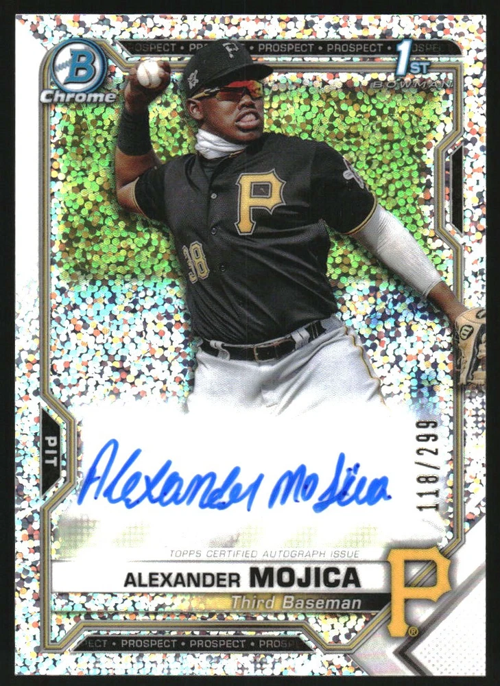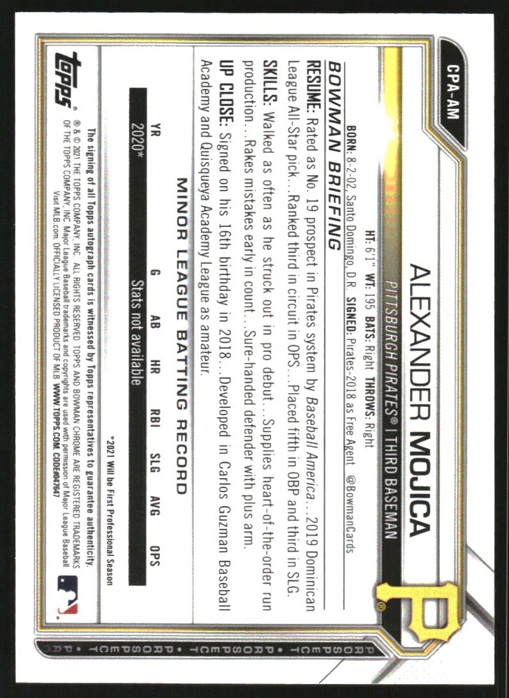 2021 Bowman Chrome Prospect Autographs Speckle Refs #CPAAM Alexander Mojica /299 Front Back Sport: Baseball Set: 2021 Bowman Chrome Prospect Autographs Speckle Refractors Year: 2021 Item#: CPAAM Player: Alexander Mojica Team: Pittsburgh Pirates Attributes: Autograph, Serial Numbered Brand: Bowman Chrome Manufacturer: Topps Co. Grading Company: Raw Grade SetType: Parallel Insert Item Condition: Near Mint/Mint 2014 Beckett Collectibles, LLC. All Rights Reserved Powered by: Thank you for choosing Burbank Sportscards, the sports cards superstore. We offer a large selection of singles across all sports. Visit our ebay store to view all our items available. Our Shipping Policy We offer Free Standard Shipping to all Domestic customers. Options for Expedited shipping are also available at checkout. For our international customers, shipping is $9.99 for the first item, and $0.25 for each additional item. Note to all customers: To qualify for combines shipping, we ask our customers to add items into the shopping cart. Please note, we do not combine orders that are placed separately. Our Service: Generally, our turnaround is super quick as we process and send out orders same day payment is received. Stock Availability: We do our best to ensure all items are in stock; however, in case of the rare stock out, the customer will have the option for a replacement card, or we will process a refund so the order is not held up. Our Images: Many of our images are stock photos from Beckett archives. They are a representation of the actual card you would receive. If you have any questions regarding the item you're interested in, please feel free to ask (serial numbers and relic pieces may vary) Moreover, in a case of a wrong or defective photo, please notify us, so we can adjust it. Other FAQ's: -When buying multiple cards, do you top load each item? No; however, we do try to insure all items are shipped securely. If you wish to have all of your cards top loaded it is a paid service and can be arranged. Please email for more details. For other questions, please feel free to ask. Thank you.