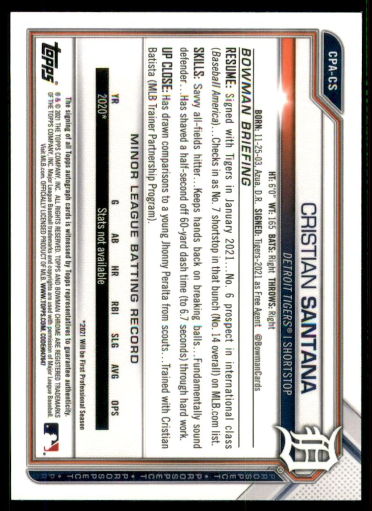 2021 Bowman Chrome Prospect Autos HTA Choice Ref #CPACS Cristian Santana /150 Front Back Sport: Baseball Set: 2021 Bowman Chrome Prospect Autographs HTA Choice Refractors Year: 2021 Item#: CPACS Player: Cristian Santana Team: Detroit Tigers Attributes: Autograph, Serial Numbered Brand: Bowman Chrome Manufacturer: Topps Co. Grading Company: Raw Grade SetType: Parallel Insert Item Condition: Near Mint/Mint 2014 Beckett Collectibles, LLC. All Rights Reserved Powered by: Thank you for choosing Burbank Sportscards, the sports cards superstore. We offer a large selection of singles across all sports. Visit our ebay store to view all our items available. Our Shipping Policy We offer Free Standard Shipping to all Domestic customers. Options for Expedited shipping are also available at checkout. For our international customers, shipping is $9.99 for the first item, and $0.25 for each additional item. Note to all customers: To qualify for combines shipping, we ask our customers to add items into the shopping cart. Please note, we do not combine orders that are placed separately. Our Service: Generally, our turnaround is super quick as we process and send out orders same day payment is received. Stock Availability: We do our best to ensure all items are in stock; however, in case of the rare stock out, the customer will have the option for a replacement card, or we will process a refund so the order is not held up. Our Images: Many of our images are stock photos from Beckett archives. They are a representation of the actual card you would receive. If you have any questions regarding the item you're interested in, please feel free to ask (serial numbers and relic pieces may vary) Moreover, in a case of a wrong or defective photo, please notify us, so we can adjust it. Other FAQ's: -When buying multiple cards, do you top load each item? No; however, we do try to insure all items are shipped securely. If you wish to have all of your cards top loaded it is a paid service and can be arranged. Please email for more details. For other questions, please feel free to ask. Thank you.