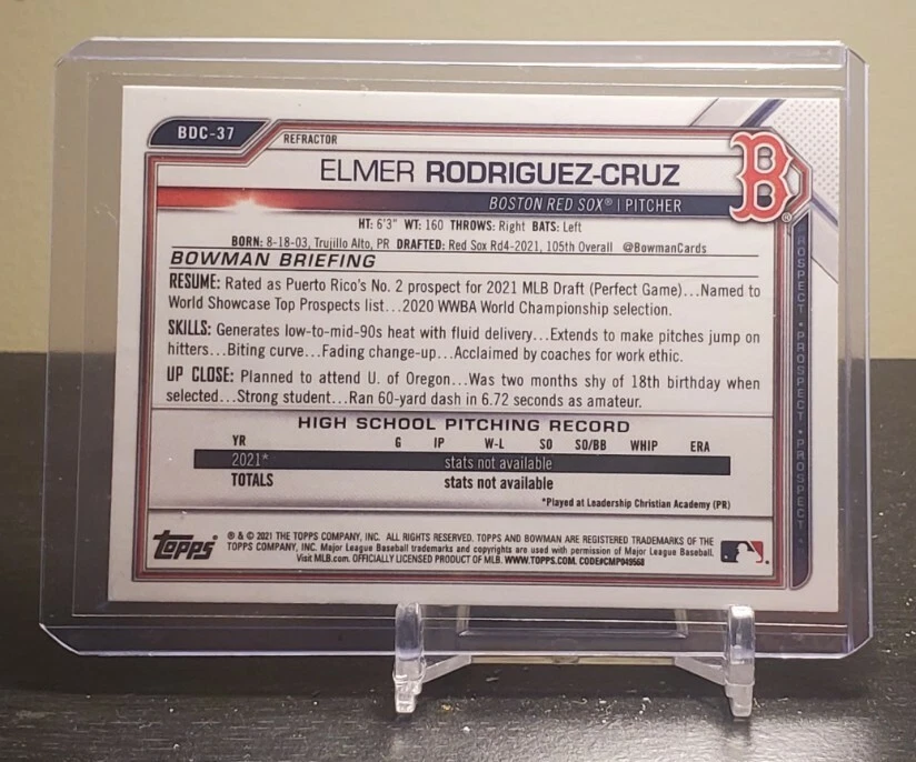 2021 Bowman Chrome Draft Refractors Baseball Card #BDC37 Elmer Rodriguez-Cruz Front Back Sport: Baseball Set: 2021 Bowman Chrome Draft Refractors Year: 2021 Item#: BDC37 Player: Elmer Rodriguez-Cruz Team: Boston Red Sox Brand: Bowman Draft Manufacturer: Topps Co. Grading Company: Raw Grade SetType: Parallel Item Condition: Near Mint/Mint 2014 Beckett Collectibles, LLC. All Rights Reserved Powered by: Thank you for choosing Burbank Sportscards, the sports cards superstore. We offer a large selection of singles across all sports. Visit our ebay store to view all our items available. Our Shipping Policy We offer Free Standard Shipping to all Domestic customers. Options for Expedited shipping are also available at checkout. For our international customers, shipping is $9.99 for the first item, and $0.25 for each additional item. Note to all customers: To qualify for combines shipping, we ask our customers to add items into the shopping cart. Please note, we do not combine orders that are placed separately. Our Service: Generally, our turnaround is super quick as we process and send out orders same day payment is received. Stock Availability: We do our best to ensure all items are in stock; however, in case of the rare stock out, the customer will have the option for a replacement card, or we will process a refund so the order is not held up. Our Images: Many of our images are stock photos from Beckett archives. They are a representation of the actual card you would receive. If you have any questions regarding the item you're interested in, please feel free to ask (serial numbers and relic pieces may vary) Moreover, in a case of a wrong or defective photo, please notify us, so we can adjust it. Other FAQ's: -When buying multiple cards, do you top load each item? No; however, we do try to insure all items are shipped securely. If you wish to have all of your cards top loaded it is a paid service and can be arranged. Please email for more details. For other questions, please feel free to ask. Thank you.
