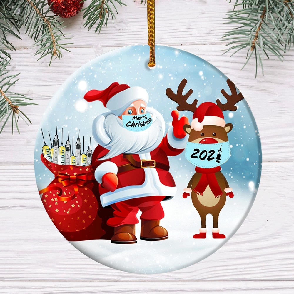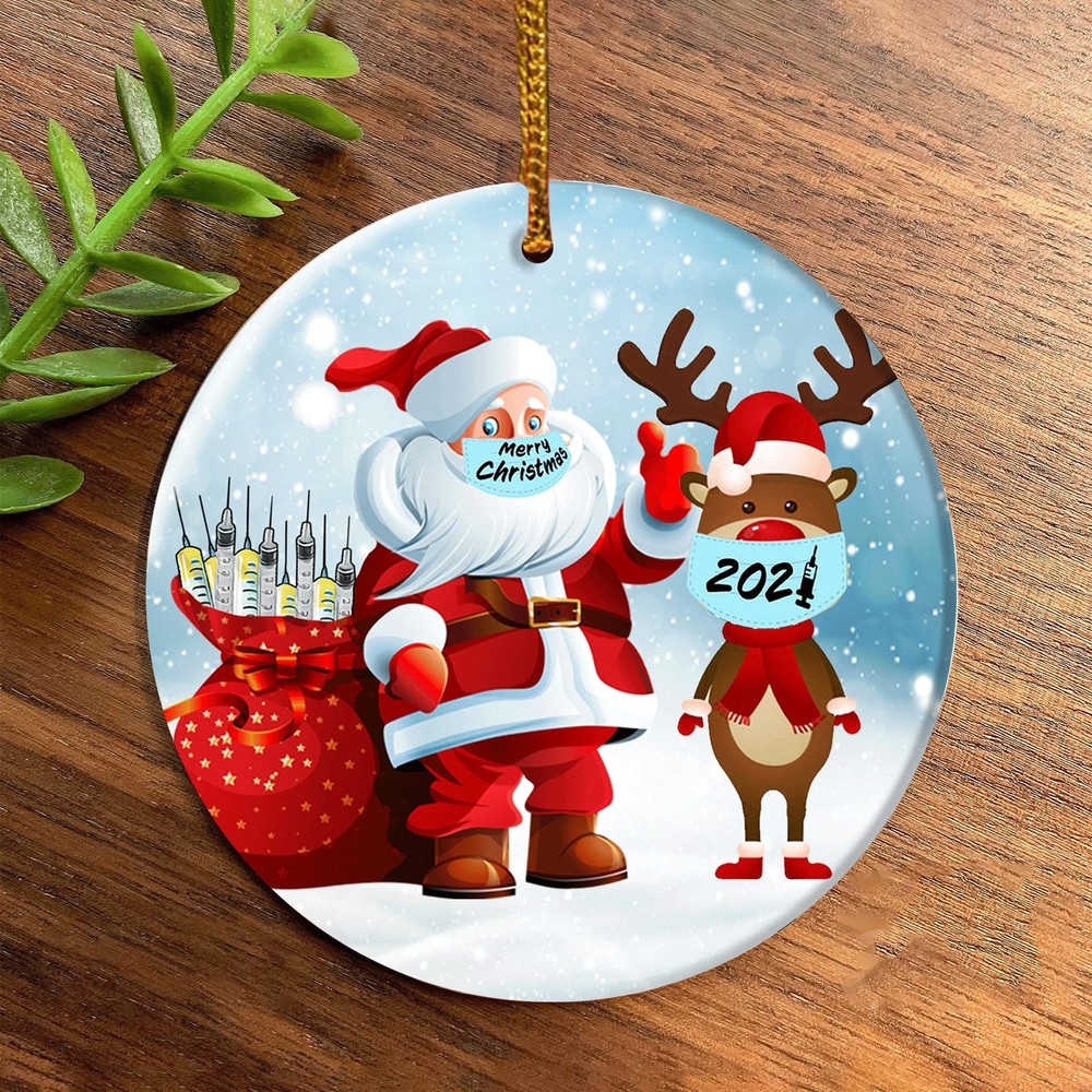 2021 Christmas Ornament Vaccinated Santa Claus and Reindeer Pandemic Decor Ornament Decoration Tree Hanging Ornament Souvenir Gift for Home Indoor Outdoor Decor Product Details Package Dimensions: 5.71 x 4.65 x 1.5 inches Item Weight: 1.8 ounces Manufacturer: Gearment Date First Available: August 24, 2021 Merry Christmas 2021! Quantity: 1, each ornament comes with a beautiful gold string for hanging and a box. High quality ceramics and inks are used to give the best product. Both sides of the ornament are printed with sublimation heat processes to ensure a permanent image. You can hang this ornament on your Christmas Tree as well as use it like a magnet and put it on your fridge, or on the wall. 2021 will definitely be a year to remember! This unique ornament is a perfect memorable gift for your family and friends on Christmas! Hanging this unique ornament on your Christmas tree or sending to families and friends as a holiday gift, it will be a perfect way to create lasting, loving memories. Design your own set of Christmas decorations to make your tree hip, traditional, or funky to suit your unique style. A set of Christmas ornaments can be the perfect heirloom to use year after year, generation after generation. These ceramic ornaments attach securely to the tree to ensure that they’re cat- and child-proof.
