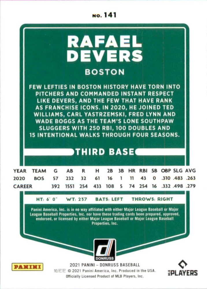 2021 Donruss Boston Red Sox Baseball Card #141 Rafael Devers Front Back Sport: Baseball Set: 2021 Donruss Year: 2021 Item#: 141 Player: Rafael Devers Team: Boston Red Sox Brand: Donruss Manufacturer: Panini Group Grading Company: Raw Grade SetType: Main Item Condition: Near Mint/Mint 2014 Beckett Collectibles, LLC. All Rights Reserved Powered by: Thank you for choosing Burbank Sportscards, the sports cards superstore. We offer a large selection of singles across all sports. Visit our ebay store to view all our items available. Our Shipping Policy We offer Free Standard Shipping to all Domestic customers. Options for Expedited shipping are also available at checkout. For our international customers, shipping is $9.99 for the first item, and $0.25 for each additional item. Note to all customers: To qualify for combines shipping, we ask our customers to add items into the shopping cart. Please note, we do not combine orders that are placed separately. Our Service: Generally, our turnaround is super quick as we process and send out orders same day payment is received. Stock Availability: We do our best to ensure all items are in stock; however, in case of the rare stock out, the customer will have the option for a replacement card, or we will process a refund so the order is not held up. Our Images: Many of our images are stock photos from Beckett archives. They are a representation of the actual card you would receive. If you have any questions regarding the item you're interested in, please feel free to ask (serial numbers and relic pieces may vary) Moreover, in a case of a wrong or defective photo, please notify us, so we can adjust it. Other FAQ's: -When buying multiple cards, do you top load each item? No; however, we do try to insure all items are shipped securely. If you wish to have all of your cards top loaded it is a paid service and can be arranged. Please email for more details. For other questions, please feel free to ask. Thank you.