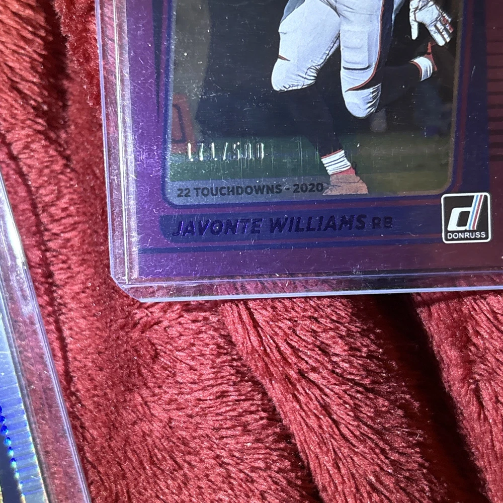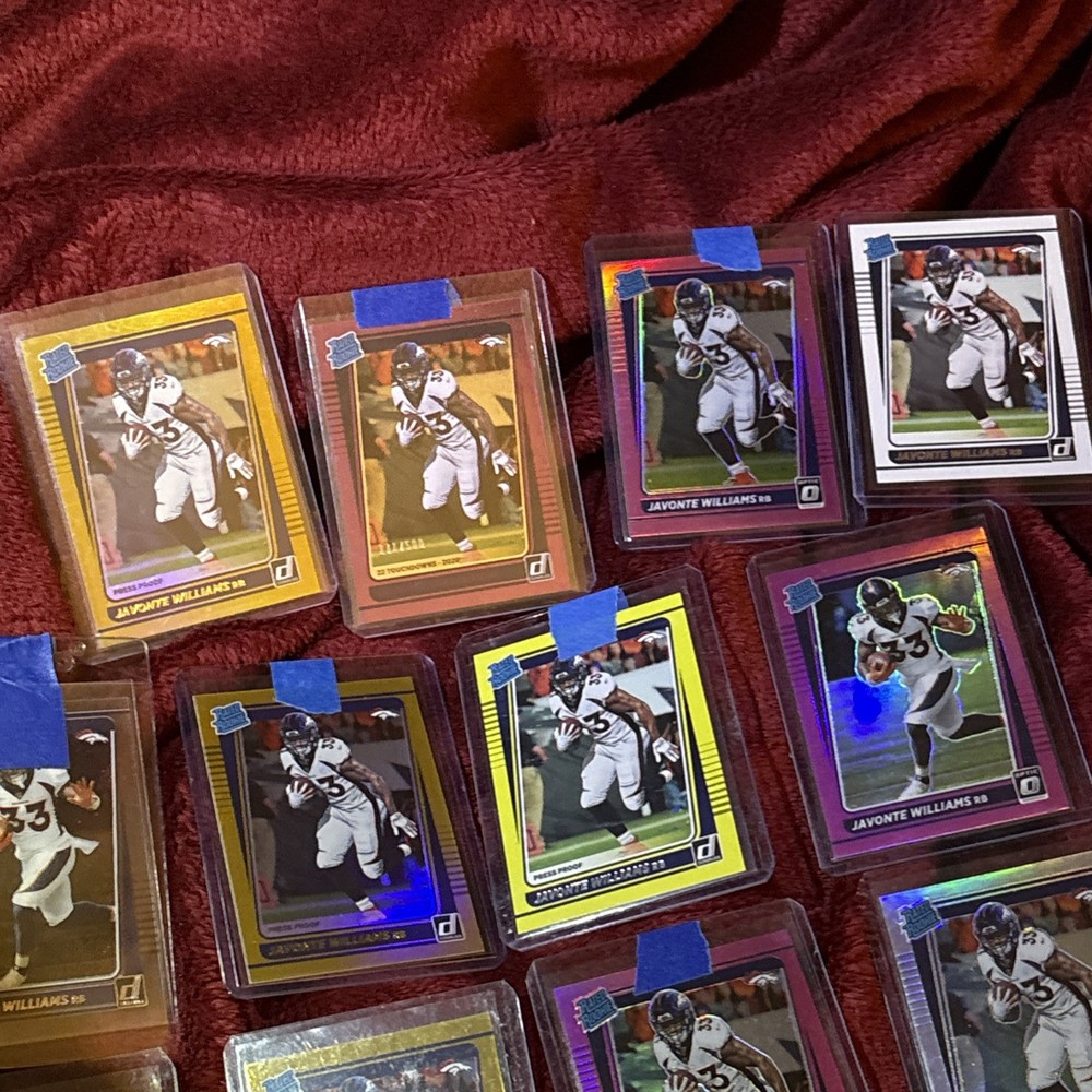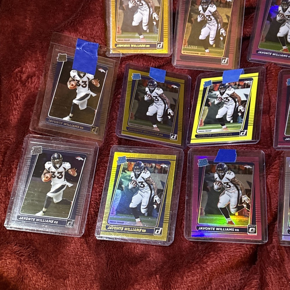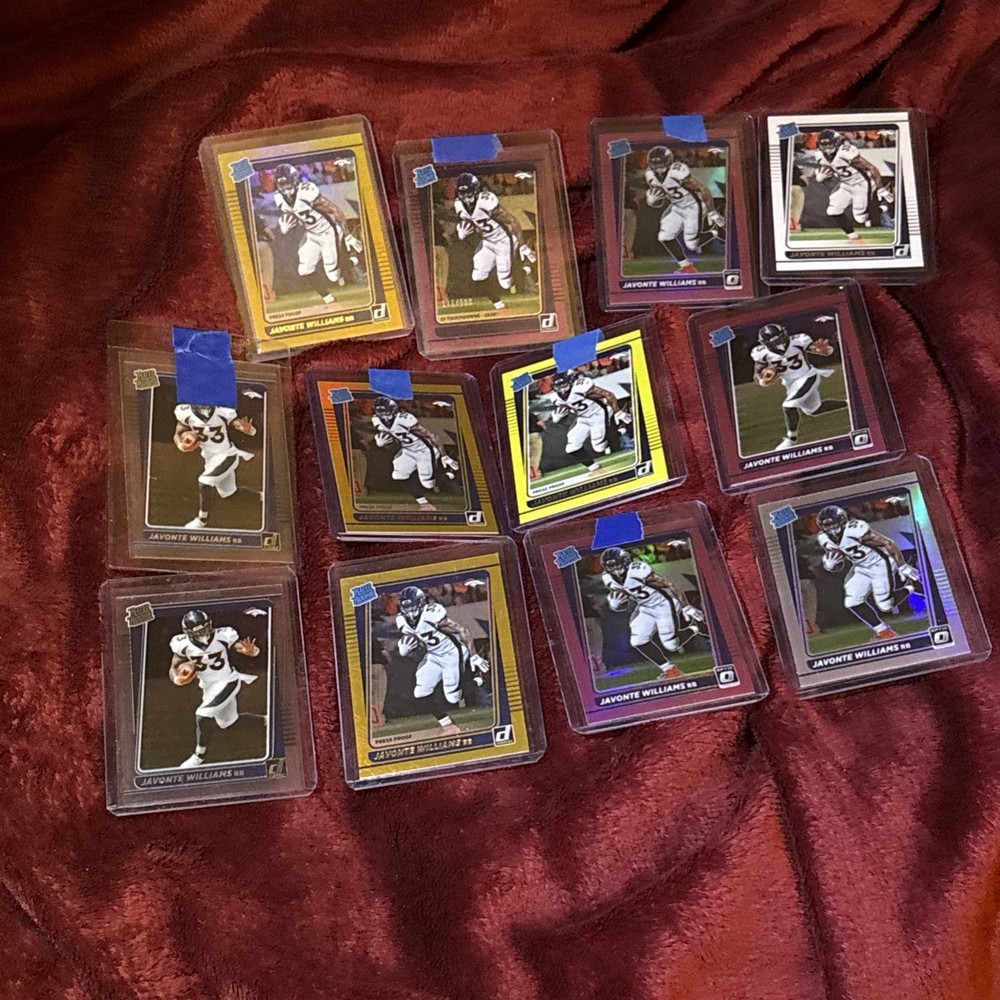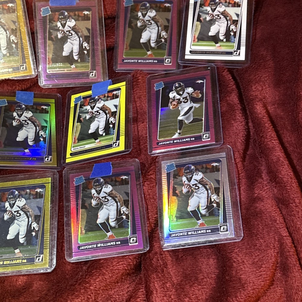 Elevate your collection with this lot of 12 Javonte Williams Rated Rookie cards from the 2021 Donruss Optic/Base set. Each card showcases the Denver Broncos' promising talent in his rookie year, making it a must-have for fans and collectors. Among the lot, one card stands out with a Purple Prizm parallel, limited to just 500 copies, adding a touch of exclusivity to your assortment. Crafted in the United States, these cards feature standard sizing and are printed on high-quality card stock, ensuring durability and a premium feel. They are original prints, not autographed, and come in English language only. Celebrate Williams' NFL journey with this captivating collection from the 2021 season.