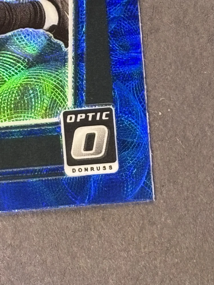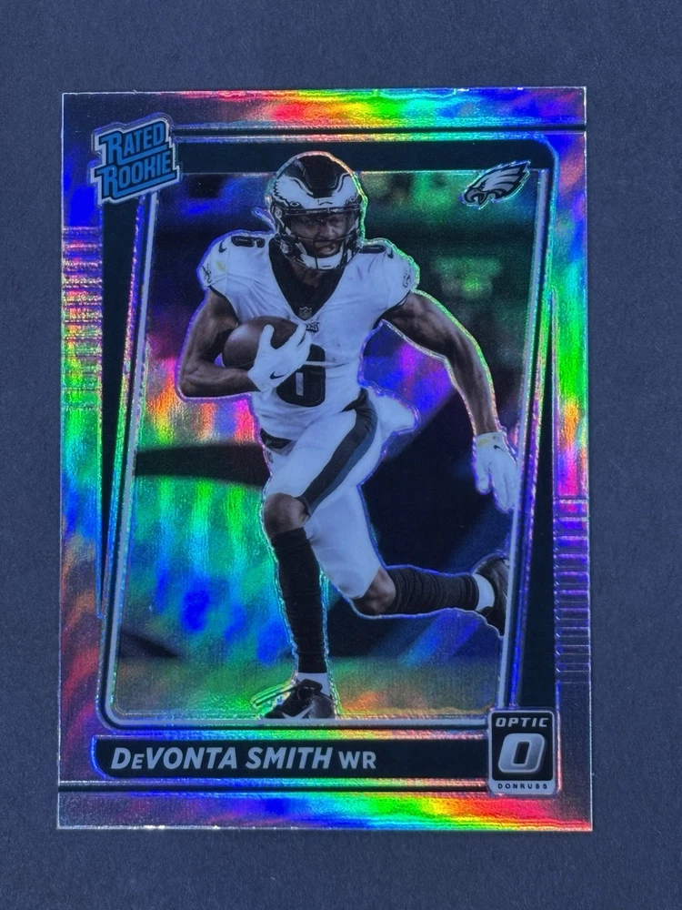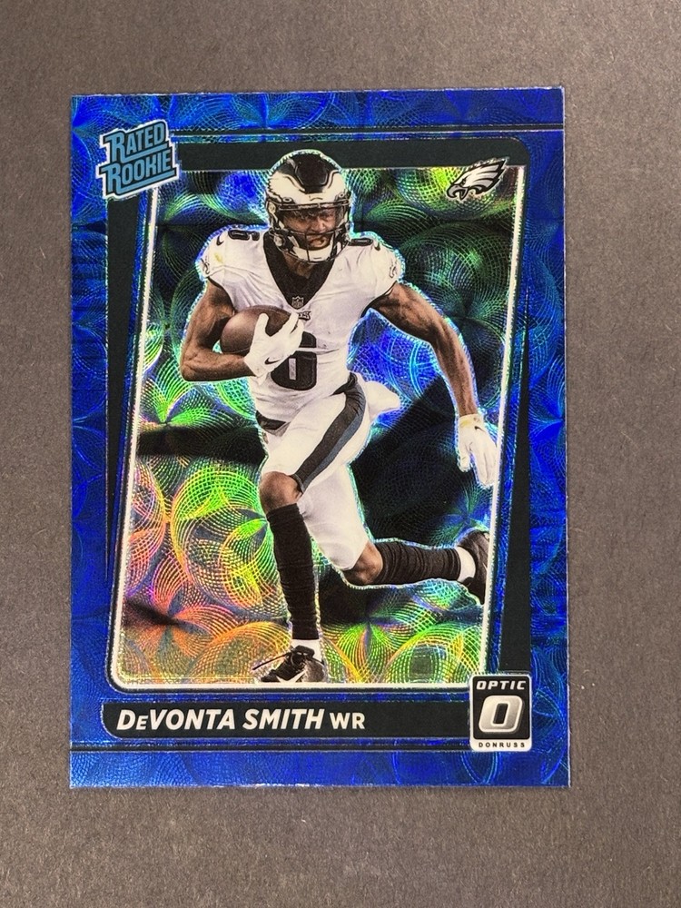 This is a lot of two 2021 Donruss Optic football trading cards featuring DeVonta Smith of the Philadelphia Eagles. The cards are part of the Blue Scope and Halo sets, both made of card stock and not autographed. They are original and licensed by Donruss, with the Blue Scope card showcasing a blue color scheme and the Halo card featuring a unique design. These rookie cards are a collectible item for fans of DeVonta Smith and the NFL.