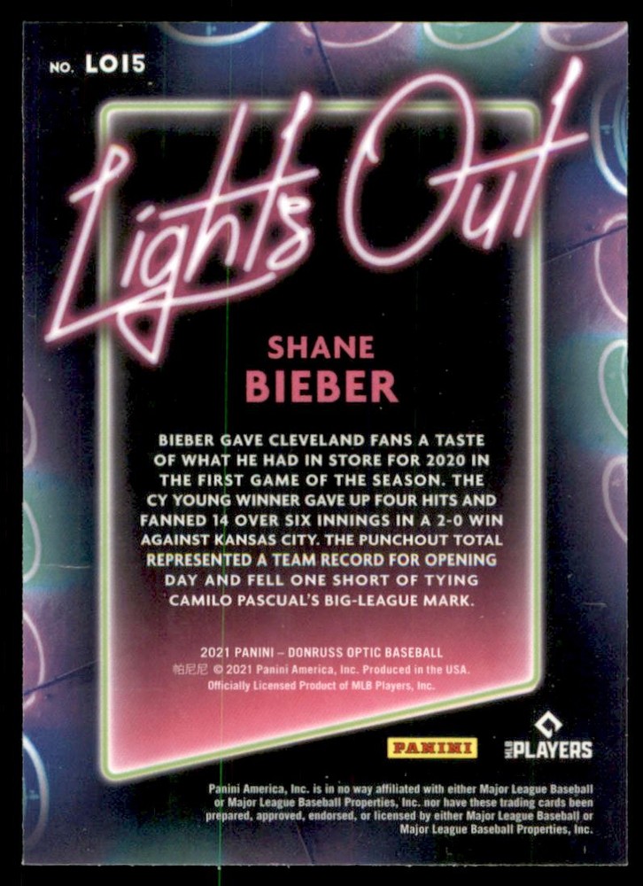 2021 Donruss Optic Lights Out Cleveland Indians Baseball Card #15 Shane Bieber Front Back Sport: Baseball Set: 2021 Donruss Optic Lights Out Year: 2021 Item#: 15 Player: Shane Bieber Team: Cleveland Indians Brand: Donruss Optic Manufacturer: Panini Group Grading Company: Raw Grade SetType: Insert Item Condition: Near Mint/Mint 2014 Beckett Collectibles, LLC. All Rights Reserved Powered by: Thank you for choosing Burbank Sportscards, the sports cards superstore. We offer a large selection of singles across all sports. Visit our ebay store to view all our items available. Our Shipping Policy We offer Free Standard Shipping to all Domestic customers. Options for Expedited shipping are also available at checkout. For our international customers, shipping is $9.99 for the first item, and $0.25 for each additional item. Note to all customers: To qualify for combines shipping, we ask our customers to add items into the shopping cart. Please note, we do not combine orders that are placed separately. Our Service: Generally, our turnaround is super quick as we process and send out orders same day payment is received. Stock Availability: We do our best to ensure all items are in stock; however, in case of the rare stock out, the customer will have the option for a replacement card, or we will process a refund so the order is not held up. Our Images: Many of our images are stock photos from Beckett archives. They are a representation of the actual card you would receive. If you have any questions regarding the item you're interested in, please feel free to ask (serial numbers and relic pieces may vary) Moreover, in a case of a wrong or defective photo, please notify us, so we can adjust it. Other FAQ's: -When buying multiple cards, do you top load each item? No; however, we do try to insure all items are shipped securely. If you wish to have all of your cards top loaded it is a paid service and can be arranged. Please email for more details. For other questions, please feel free to ask. Thank you.