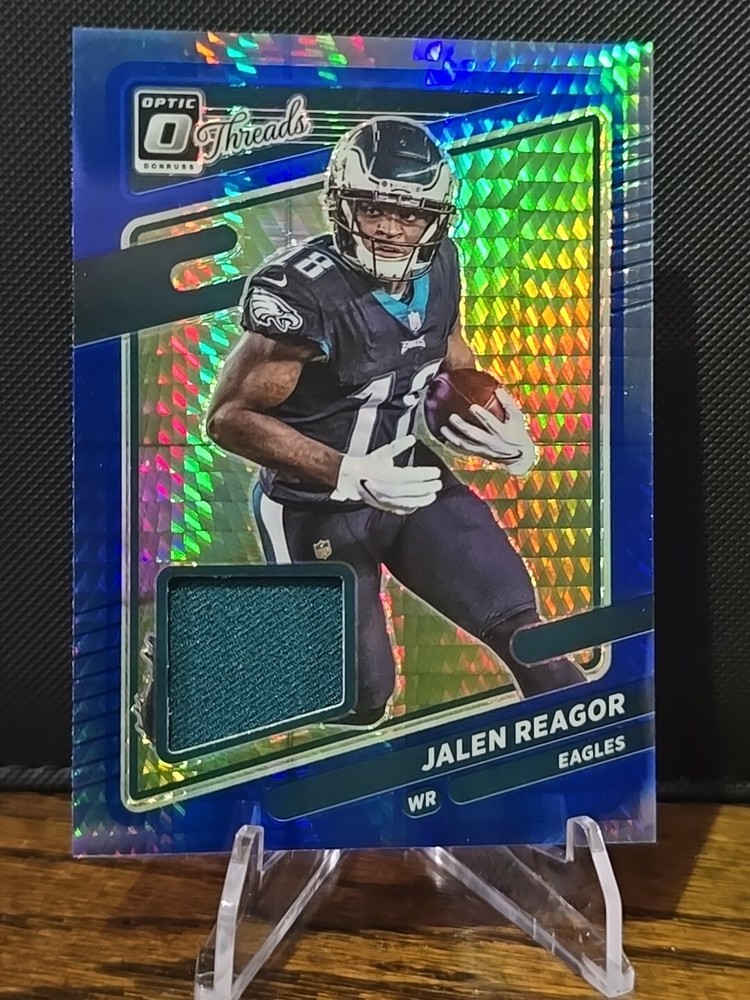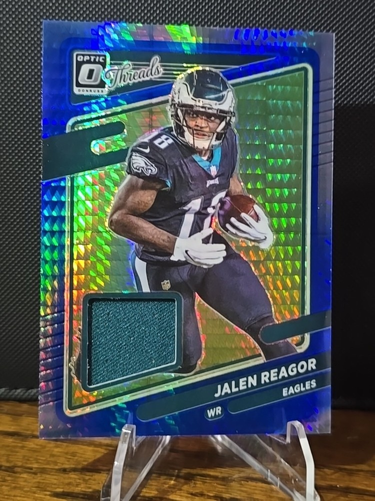 The 2021 Donruss Optic Threads Jalen Reagor Mem Patch Hyper Blue Eagles card features a memorabilia patch of Philadelphia Eagles player Jalen Reagor. This original sports trading card is part of the 2021 Panini Donruss Optic set and includes a patch variation, making it a unique addition for collectors of NFL trading cards. The card is in near mint or better condition and showcases Reagor as part of the National Football League (NFL) season.