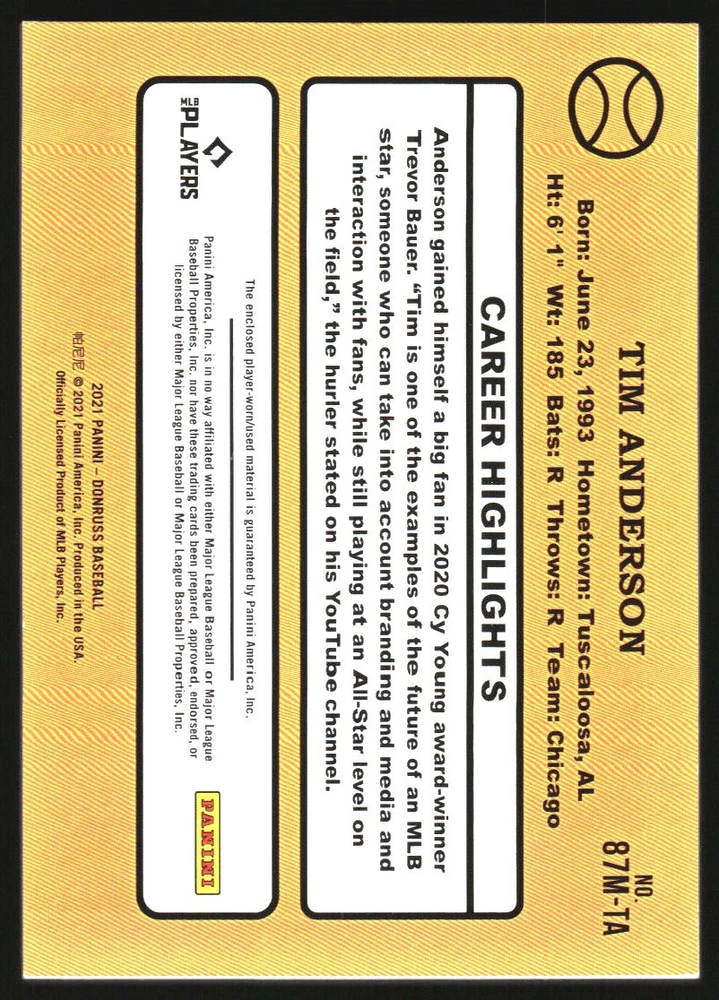 2021 Donruss Retro '87 Materials Gold #87MTA Tim Anderson Jersey /25 Front Back Sport: Baseball Set: 2021 Donruss Retro '87 Materials Gold Year: 2021 Item#: 87MTA Player: Tim Anderson Team: Chicago White Sox Attributes: Memorabilia, Serial Numbered Brand: Donruss Manufacturer: Panini Group Grading Company: Raw Grade SetType: Parallel Insert Item Condition: Near Mint/Mint 2014 Beckett Collectibles, LLC. All Rights Reserved Powered by: Thank you for choosing Burbank Sportscards, the sports cards superstore. We offer a large selection of singles across all sports. Visit our ebay store to view all our items available. Our Shipping Policy We offer Free Standard Shipping to all Domestic customers. Options for Expedited shipping are also available at checkout. For our international customers, shipping is $9.99 for the first item, and $0.25 for each additional item. Note to all customers: To qualify for combines shipping, we ask our customers to add items into the shopping cart. Please note, we do not combine orders that are placed separately. Our Service: Generally, our turnaround is super quick as we process and send out orders same day payment is received. Stock Availability: We do our best to ensure all items are in stock; however, in case of the rare stock out, the customer will have the option for a replacement card, or we will process a refund so the order is not held up. Our Images: Many of our images are stock photos from Beckett archives. They are a representation of the actual card you would receive. If you have any questions regarding the item you're interested in, please feel free to ask (serial numbers and relic pieces may vary) Moreover, in a case of a wrong or defective photo, please notify us, so we can adjust it. Other FAQ's: -When buying multiple cards, do you top load each item? No; however, we do try to insure all items are shipped securely. If you wish to have all of your cards top loaded it is a paid service and can be arranged. Please email for more details. For other questions, please feel free to ask. Thank you.