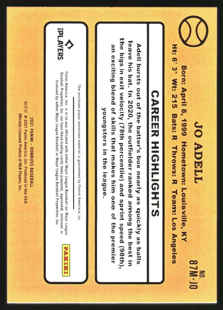 2021 Donruss Retro '87 Materials Red #87MJA Jo Adell Jersey /99 Front Back Sport: Baseball Set: 2021 Donruss Retro '87 Materials Red Year: 2021 Item#: 87MJA Player: Jo Adell Team: Los Angeles Angels Attributes: Memorabilia, Serial Numbered Brand: Donruss Manufacturer: Panini Group Grading Company: Raw Grade SetType: Parallel Insert Item Condition: Near Mint/Mint 2014 Beckett Collectibles, LLC. All Rights Reserved Powered by: Thank you for choosing Burbank Sportscards, the sports cards superstore. We offer a large selection of singles across all sports. Visit our ebay store to view all our items available. Our Shipping Policy We offer Free Standard Shipping to all Domestic customers. Options for Expedited shipping are also available at checkout. For our international customers, shipping is $9.99 for the first item, and $0.25 for each additional item. Note to all customers: To qualify for combines shipping, we ask our customers to add items into the shopping cart. Please note, we do not combine orders that are placed separately. Our Service: Generally, our turnaround is super quick as we process and send out orders same day payment is received. Stock Availability: We do our best to ensure all items are in stock; however, in case of the rare stock out, the customer will have the option for a replacement card, or we will process a refund so the order is not held up. Our Images: Many of our images are stock photos from Beckett archives. They are a representation of the actual card you would receive. If you have any questions regarding the item you're interested in, please feel free to ask (serial numbers and relic pieces may vary) Moreover, in a case of a wrong or defective photo, please notify us, so we can adjust it. Other FAQ's: -When buying multiple cards, do you top load each item? No; however, we do try to insure all items are shipped securely. If you wish to have all of your cards top loaded it is a paid service and can be arranged. Please email for more details. For other questions, please feel free to ask. Thank you.
