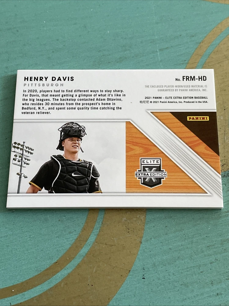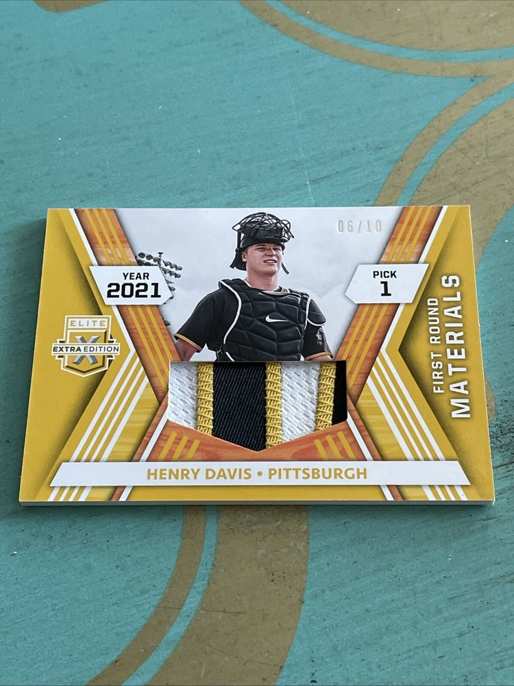 For avid collectors of baseball memorabilia, this 2021 Panini Elite Extra Edition Gold 1st Round Materials #FRM-HD Henry Davis trading card is a must-have. This card features a Pittsburgh Pirates player, Henry Davis, and is made of high-quality materials that make it a durable addition to any collection. With a serial number of 06/10, this card is a rare find that any Major League (MLB) fan would love to add to their collection. It is ungraded, but its quality is evident in its design and construction. This card is an insert with a parallel/variety of materials, making it a unique and valuable addition to any sports trading card collection.