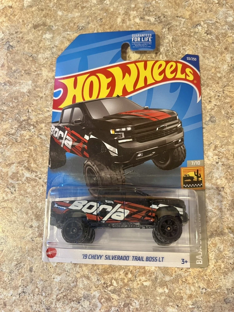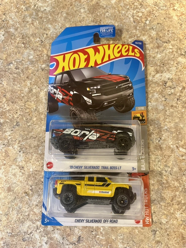 The product is a 2021 Hot Wheels set featuring two Chevrolet pickup trucks in 1:64 scale. One truck is a yellow Chevy Silverado Off Road and the other is a 2019 Trail Boss in black. Both vehicles are diecast and come in unopened boxes from the HW HOT TRUCKS series. Suitable for boys and girls aged 3 and up, this set is part of the Cars character family and was released in 2021 by the Hot Wheels brand.