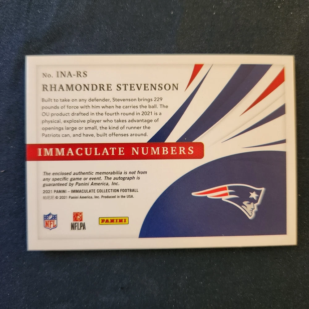 This 2021 National Treasures trading card features Rhamondre Stevenson, a hard-signed autographed memorabilia from the New England Patriots player. The card is a limited edition FOTL, with only 18 produced, and is a must-have for any NFL collector. The autograph authentication is performed by Panini Authentic, and the card features a green foil parallel/variety. Additionally, the card is a rookie card, making it even more valuable to fans and collectors alike. This unique item is perfect for display or as an addition to any trading card collection.