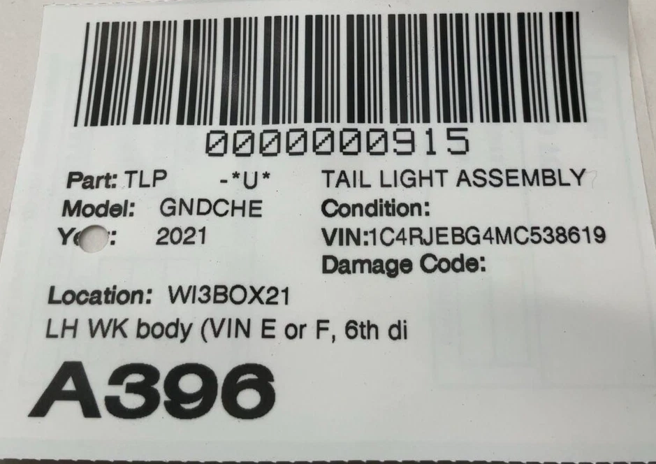 HK Auto Salvage HK Auto Salvage Montebello, CA Business Hours (PST/PDT) Mon - Fri 8am - 5pm Saturday 8am - 2pm Closed Sat & Sun Tail Light Assembly Year: 21 Model: JEEP GRAND CHEROKEE Side: Left Type: Used Category: W Condition: VIN: 1C4RJEBG4MC538619 Vehicle Stock #: A396 Part Stock #: 0000000915 Vehicle Info: DARK BLUE EXT,BLACK INT Additional notes: Wk Body (vin E Or F, 6th Digit), Quarter Panel Mounted, W/o Bezel Trim; Lh Nice See Pictures Interchange: WK body (VIN E or F, 6th digit), quarter panel mounted, w/o bezel trim; LH Also fits: Search for more parts from this donor vehicle Search for more parts for JEEP GRAND CHEROKEE Airbag Notification If the item above is an airbag, I certify this airbag is not subject to recall and will be shipped in accordance with hazmat shipping requirements . Payment We accept credit cards through eBay Managed Payments only Sales tax collected by eBay where applicable COD available for orders placed for delivery to local businesses; please contact us prior to purchase to arrange Pay on pickup available for orders placed for local pickup Shipping We ship by FedEx, UPS, and USPS. Most items ship within 24 hours of payment; items paid for on the weekend or holidays ship on the following business day. Any free shipping we offer is for the continental United States only. If you are from Hawaii, Alaska, or a Territory of the United States, please request a shipping total before bidding and we will do our best to keep the cost low. Local delivery and local pickup options are also available. Warranty & Returns 30-day standard warranty on all general parts 90-day standard warranty on engines and transmissions Please verify fitment independently prior to purchase, as the information in the "compatibility" section above is generated by eBay Motors and not from us. If you have questions or concerns about fitment, please contact us prior to purchase. Contact Us If you have any questions regarding an eBay item, please CONTACT US via eBay messaging before you make the purchase. Please verify fitment independently prior to purchase, as the information in the "compatibility" section above is generated by eBay Motors and not from us. If you have questions or concerns about fitment, please contact us prior to purchase. After you have received your product in satisfactory condition, please leave us positive feedback. If there is a problem with your purchase, do not leave neutral or negative feedback: CONTACT US so that we can help you to resolve your issue to your satisfaction. Powered by Checkmate
