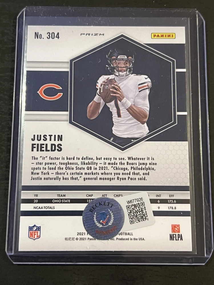 For the avid sports fan, this 2021 Justin Fields Mosaic Honeycomb Authentic Auto trading card is a must-have. Featuring the talented quarterback of the Chicago Bears, this card is guaranteed to be a valuable addition to your collection. With its beautiful design and unique mosaic parallel variety, it is sure to stand out in your display. This card is autographed by Justin Fields himself, adding a touch of personalization to your collection. It is ungraded, but the card number is 304 and it is from the 2021 Panini Mosaic set. Perfect for the NFL enthusiast, this sports trading card is a great way to show your support for your favorite team and player. Beckett Certified
