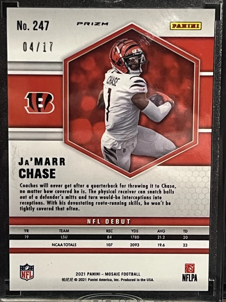 2021 Mosaic Ja’Marr Chase Gold Wave /17 Bengals No.247 . Condition is Ungraded. Shipped with USPS Ground Advantage.