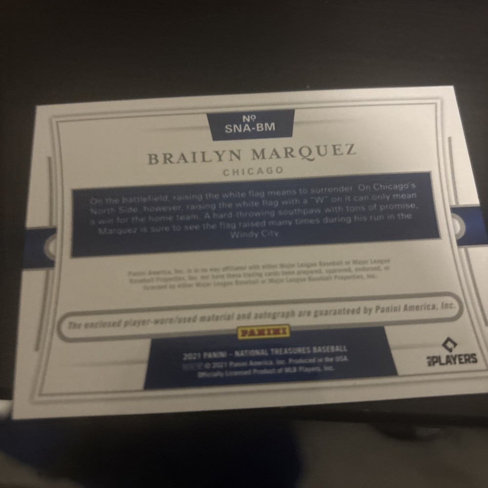 Parallel/Variety:SignaturesManufacturer:PaniniFeatures:Parallel/Variety, Rookie, Serial Numbered, AutoCountry/Region of Manufacture:United StatesLanguage:EnglishSeason:2021Type:Sports Trading CardSport:BaseballPlayer/Athlete:Brailyn MarquezOriginal/Licensed Reprint:OriginalTeam:Chicago CubsYear Manufactured:2021Autographed:YesCustom Bundle:NoLeague:Major League (MLB)Vintage:NoSet:2021 National Treasures