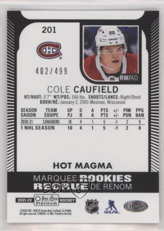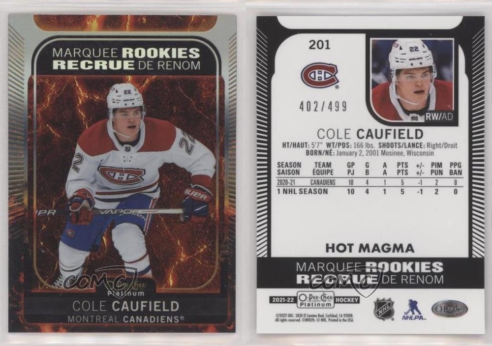 2021-22 O-Pee-Chee Platinum - [Base] - Hot Magma #201 Marquee Rookies - Cole Caufield Serial #402/499 COMC Item: 168527875 - RC (Rookie Card) - Ice Hockey Card - Featuring the Montreal Canadiens - Featuring Cole Caufield Search for more: 2021-22 O-Pee-Chee Platinum Search for more: 2021-22 O-Pee-Chee Platinum - [Base] - Hot Magma View all of our Listings Auctions Buy It Now About Us Located in the beautiful Pacific Northwest, COMC (Check Out My Cards) is the world's largest consignment service for trading card singles. More than 10,000 people have used our consignment service to list over 50 million trading cards. Find out how we can help you consign your items on eBay by contacting us through eBay messaging. COMC -- "The Safe & Easy Way to Buy & Sell" Raw Condition for Modern Cards Unless otherwise noted, raw modern cards are listed in Near Mint-Mint condition or better. A NM-MT card appears to be Mint at first glance, but upon closer inspection, may exhibit some of the following: minor print defects (e.g. roller marks, print line, dimple), minor scratches, slight edge wear, and slight corner wear. Centering is clearly visible in the images provided and does not factor into our condition assessment. Raw Condition for Vintage Cards Unless otherwise noted, raw vintage cards are listed in Excellent condition or better. An EX card may exhibit some of the following: minor rounding of corners, surface wear, print defects, light scratches, and slight edge wear/chipping. Centering is clearly visible in the images provided and does not factor into our condition assessment. Domestic Shipping Combined shipping for multiple items is available. To receive combined shipping, please ensure all desired items are in your eBay shopping cart before proceeding to checkout. eBay limits orders to 40 items per order. We automatically combine multiple orders placed on the same day. If you place multiple orders on the same day, please contact us to request a refund of applicable shipping costs. Signature confirmation may be required on invoices over $400. All cards are protected and shipped securely. International Shipping COMC offers eBay's International Shipping (EIS) for international orders under $2,500* (see country exceptions below). All duties and import fees are paid at checkout; in the rare event that there are additional import fees upon delivery, these are borne by the buyer. EIS packages route through a shipping hub in Erlanger, KY before shipping to their final destination. Please note that EIS does not allow for combined shipments. The shipping rates are determined by eBay and cannot be adjusted. *Maximum sale price exceptions: Colombia, Kuwait ($2,000); Taiwan ($1,539); Chile, Costa Rica, Guatemala, Honduras, Trinidad and Tobago ($1,000); Antigua and Barbuda, Aruba, Belize, Dominica, Grenada, Philippines, Saint Kitts and Nevis, Saint Lucia, Montserrat, Turks and Caicos Islands ($500); Dominican Republic, El Salvador ($200). Please request a shipping quote through eBay messaging for orders that exceed the maximum sale price supported by eBay's International Shipping. You will be responsible for all duties and import fees for international orders shipped outside the EIS. All cards are protected and shipped securely. Auction Bidding By placing a bid on our auctions, you are making a commitment to complete the purchase. Payment is due within 7 days of winning an auction. Bidders who neglect to pay for an item they win will be blocked from making any future purchases and will be reported to eBay. Payment COMC does not accept offers on our cards through our eBay storefront. COMC utilizes eBay’s managed payments system. If you are experiencing difficulties making a payment, please contact eBay for assistance. Return policy Returns are only accepted on the rare occasion the item is not as described. If you are making a return, please initiate the return process through eBay so a mailing label can be provided for you. Prior to listing, our expert team carefully assessed this item to represent it accurately. Please review the description and high-definition images prior to bidding to ensure this item meets your satisfaction. We welcome you to contact us if you have further questions about this item. Trust and Integrity Shill bidding is prohibited on COMC Auctions. We collaborate with eBay to monitor and identify bidding activity which does not appear to be in good faith. If we determine a bidder is operating outside of eBay’s guidelines, we may choose to cancel their bids, permanently block them from purchasing from COMC, and report them to eBay. Shill bidding is also illegal in many places and can carry severe penalties. COMC carefully assesses each item consigned to us to prevent fraudulent items from entering the marketplace. If you believe an item offered on COMC may be fraudulent, please contact us with details so we can investigate the issue. Items we determine are outside our supported items policy may be removed. Last Modified: 12/1/2025 5:05:02 PM PDT