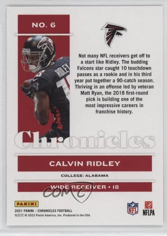 High End Hobby Card Auctions Starting @ $1.99 w/ combined shipping for multiple items purchased. So, the more cards you win, the less you pay per card. Featuring NFL options of 2022 Mosaic Sparkles, 2023 Prizm Football Checkerboard Prizms, 2023 Phoenix Football, & More. Rookies & Veterans. All cards Limited, Short Print, Super Short Print, or Have a Serial Number. So, check out my Seller's Other Items, and get into my store before you miss out on the cards you're looking for. Don't forget to hit the heart sign next to my seller name to follow my page, and get updates on all of my upcoming auctions. Currently have about 20,000 cards to get caught up on posting. So, I'm starting a free high end hobby card giveaway, since the last one went so well. Every 5th card sold, and paid for will come with a free high end hobby card that I match to the team, or sport you purchased. This now goes until December 31st. The giveaway went so well we gave over 50 cards SP, or #'d away to our loyal customers. All cards posted on my account are included in the giveaway. Stay tuned, and appreciate everyone who took part in my last giveaway. Thanks for your time, and rest assured all cards are shipped in water resistant bubble mailers, and w/ a Top Loader, Hard Case, and Dust Cover. No tape anywhere to damage your card during shipping, and a tracking number attached to every card so you know you are getting what you paid for. This limited edition 2021 Panini Chronicles Football card features Calvin Ridley of the Atlanta Falcons. The card is a blue foil version and is serial numbered, making it a rare find for collectors. It is in near mint to mint condition and has a card thickness of 35 Pt. The card is an original and is not a licensed reprint. The card has several features, including being a 1st edition, chase, and short print. It also has a hologram and is part of the collectors edition. The card is made of high-quality card stock and is in English. This card is a great addition to any sports trading card collection and is perfect for fans of the Atlanta Falcons and Calvin Ridley.