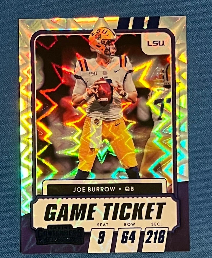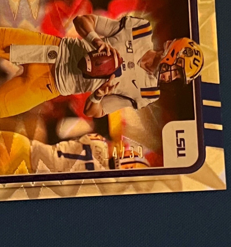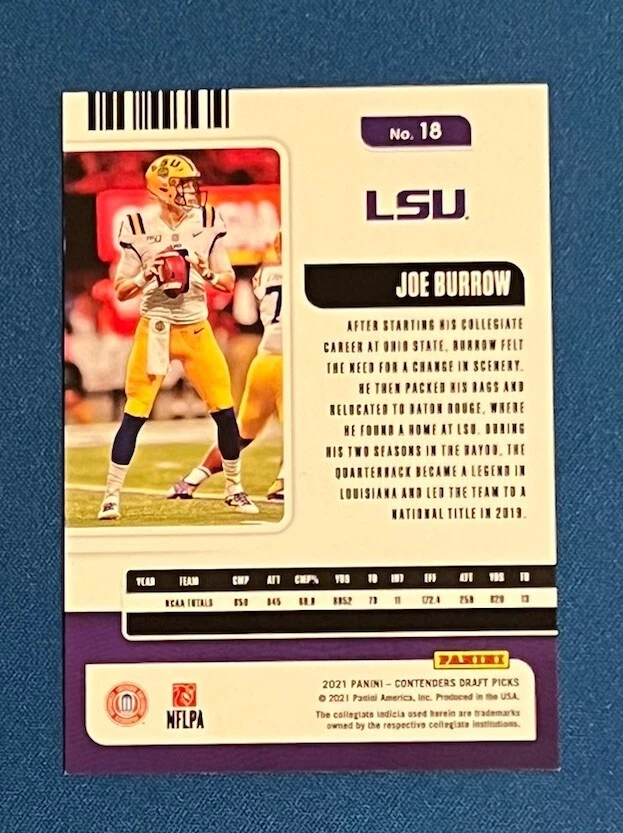 This 2021 Panini Contenders Draft Picks card features Joe Burrow, a talented player from the Cincinnati Bengals and LSU Tigers teams. The card is a foil parallel with a print run of 39 and is numbered 18 in the set. It is a standard-sized sports trading card that is perfect for any NFL fan's collection. The card is in excellent shape and is near mint or better. It has not been graded and is unautographed. This card is a great addition to any sports trading card collection and is sure to impress. Don't miss your chance to own this amazing card!