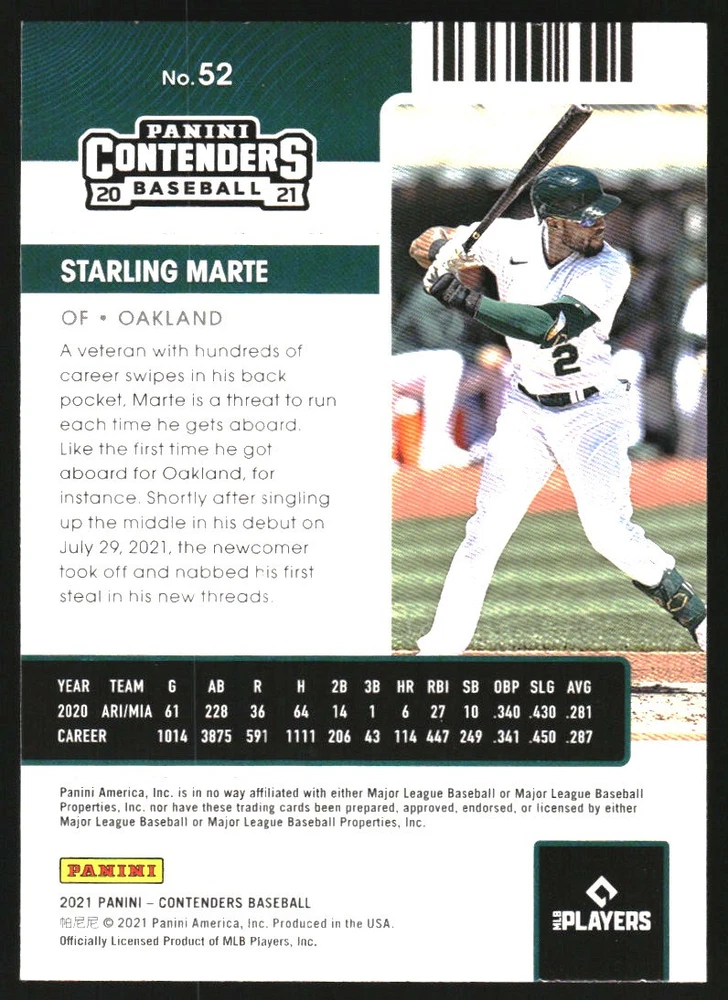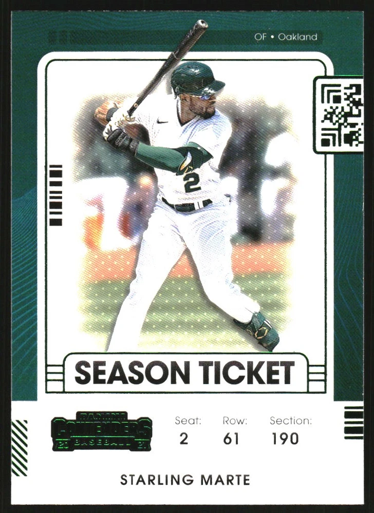 2021 Panini Contenders Season Ticket Green #52 Starling Marte Front Back Sport: Baseball Set: 2021 Panini Contenders Season Ticket Green Year: 2021 Item#: 52 Player: Starling Marte Team: Oakland Athletics Brand: Panini Contenders Manufacturer: Panini Group Grading Company: Raw Grade SetType: Parallel Item Condition: Near Mint/Mint 2014 Beckett Collectibles, LLC. All Rights Reserved Powered by: Thank you for choosing Burbank Sportscards, the sports cards superstore. We offer a large selection of singles across all sports. Visit our ebay store to view all our items available. Our Shipping Policy We offer Free Standard Shipping to all Domestic customers. Options for Expedited shipping are also available at checkout. For our international customers, shipping is $9.99 for the first item, and $0.25 for each additional item. Note to all customers: To qualify for combines shipping, we ask our customers to add items into the shopping cart. Please note, we do not combine orders that are placed separately. Our Service: Generally, our turnaround is super quick as we process and send out orders same day payment is received. Stock Availability: We do our best to ensure all items are in stock; however, in case of the rare stock out, the customer will have the option for a replacement card, or we will process a refund so the order is not held up. Our Images: Many of our images are stock photos from Beckett archives. They are a representation of the actual card you would receive. If you have any questions regarding the item you're interested in, please feel free to ask (serial numbers and relic pieces may vary) Moreover, in a case of a wrong or defective photo, please notify us, so we can adjust it. Other FAQ's: -When buying multiple cards, do you top load each item? No; however, we do try to insure all items are shipped securely. If you wish to have all of your cards top loaded it is a paid service and can be arranged. Please email for more details. For other questions, please feel free to ask. Thank you.