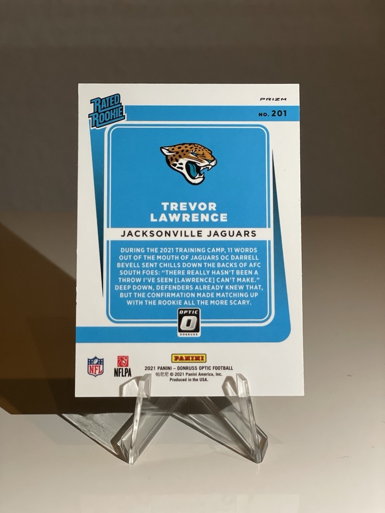 Tauchen Sie ein in die Welt des American Footballs mit der begehrten 2021 Panini Donruss Optic Rated Rookie-Karte von Trevor Lawrence, Nummer 201, in der außergewöhnlichen Holo Prizm-Variante. Diese Karte ist ein Muss für Sammler und Fans des talentierten Spielers von den Jacksonville Jaguars. Sie stammt aus der renommierten Saison 2021 und repräsentiert einen echten Höhepunkt in der Sammlung von NFL-Memorabilia. Diese Sport Trading Card zeichnet sich durch ihre hervorragende Erhaltung nahezu neuwertig oder besser aus und ist ein Highlight für jede Sammlung. Mit ihrem glänzenden Holo Prizm-Finish und den Eigenschaften Basis-Set, Rookie und Parallel/Variante bietet sie eine einzigartige Bereicherung für Liebhaber des Sports und speziell für Anhänger von Trevor Lawrence. Ergreifen Sie die Chance, ein Stück Football-Geschichte zu besitzen! Versand im Toploader und Luftpolstertasche