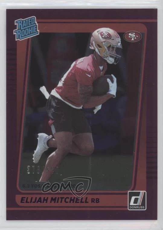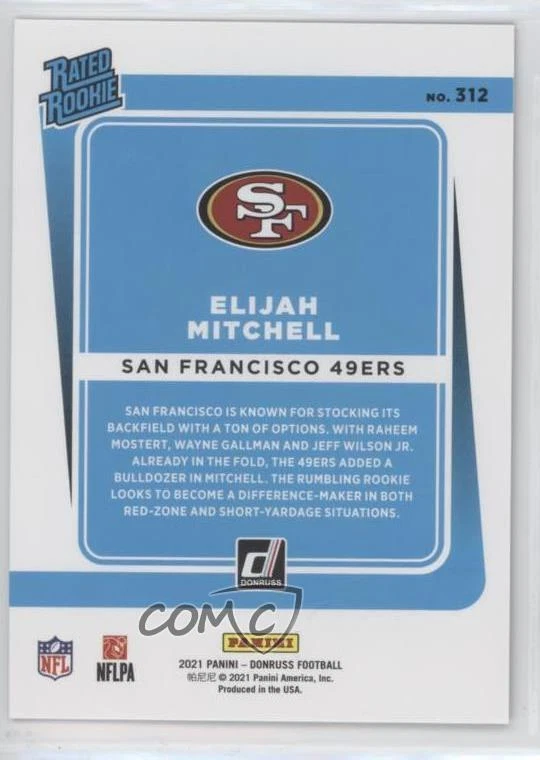 2021 Panini Donruss - [Base] - Season Stat Line #312 Rated Rookie - Elijah Mitchell Qty Made: 500 - RC (Rookie Card) - Football Card - Featuring the San Francisco 49ers - Featuring Elijah Mitchell Search for more: 2021 Panini Donruss Search for more: 2021 Panini Donruss - [Base] - Season Stat Line View all of our Listings Auctions Buy It Now About Us Located in the beautiful Pacific Northwest, COMC (Check Out My Cards) is the world's largest consignment service for trading card singles. More than 10,000 people have used our consignment service to list over 50 million trading cards. We currently house 20 million cards, each listed for sale with front and back images of the actual card. Find out how we can help you consign your items on eBay by contacting us through eBay messaging. COMC -- "The Safe & Easy Way to Buy & Sell" Representative Image - Select Specific Item above to see image of actual item Representative Image - Select Specific Item above to see image of actual item Raw Condition for Modern Cards Unless otherwise noted, raw modern cards are listed in Near Mint-Mint condition or better. A NM-MT card appears to be Mint at first glance, but upon closer inspection, may exhibit some of the following: minor print defects (e.g. roller marks, print line, dimple), minor scratches, slight edge wear, and slight corner wear. Centering is clearly visible in the images provided and does not factor into our condition assessment. Raw Condition for Vintage Cards Unless otherwise noted, raw vintage cards are listed in Excellent condition or better. An EX card may exhibit some of the following: minor rounding of corners, surface wear, print defects, light scratches, and slight edge wear/chipping. Centering is clearly visible in the images provided and does not factor into our condition assessment. Domestic Shipping Combined shipping for multiple items is available. To receive combined shipping, please ensure all desired items are in your eBay shopping cart before proceeding to checkout. eBay limits orders to 40 items per order. We automatically combine multiple orders placed on the same day. If you place multiple orders on the same day, please contact us to request a refund of applicable shipping costs. Signature confirmation may be required on invoices over $400. Raw cards are shipped in toploaders. International Shipping COMC offers eBay's International Shipping (EIS) for international orders under $2,500* (see country exceptions below). All duties and import fees are paid at checkout; in the rare event that there are additional import fees upon delivery, these are borne by the buyer. EIS packages route through a shipping hub in Erlanger, KY before shipping to their final destination. Please note that EIS does not allow for combined shipments. The shipping rates are determined by eBay and cannot be adjusted. *Maximum sale price exceptions: Colombia, Kuwait ($2,000); Taiwan ($1,539); Chile, Costa Rica, Guatemala, Honduras, Trinidad and Tobago ($1,000); Antigua and Barbuda, Aruba, Belize, Dominica, Grenada, Philippines, Saint Kitts and Nevis, Saint Lucia, Montserrat, Turks and Caicos Islands ($500); Dominican Republic, El Salvador ($200). Please request a shipping quote through eBay messaging for orders that exceed the maximum sale price supported by eBay's International Shipping. You will be responsible for all duties and import fees for international orders shipped outside the EIS. Raw cards are shipped in toploaders. Payment COMC does not accept offers on our cards through our eBay storefront. COMC utilizes eBay’s managed payments system. If you are experiencing difficulties making a payment, please contact eBay for assistance. Return Policy Returns are only accepted on the rare occasion the item is not as described. If you are making a return, please initiate the return process through eBay so a mailing label can be provided for you. Prior to listing, our expert team carefully assessed this item to represent it accurately. Please review the description and high-definition images prior to purchasing to ensure this item meets your satisfaction. We welcome you to contact us if you have further questions about this item. Trust and Integrity COMC carefully assesses each item consigned to us to prevent fraudulent items from entering the marketplace. If you believe an item offered on COMC may be fraudulent, please contact us with details so we can investigate the issue. Items we determine are outside our supported items policy may be removed. Last Modified: 11/28/2024 2:50:34 PM PDT