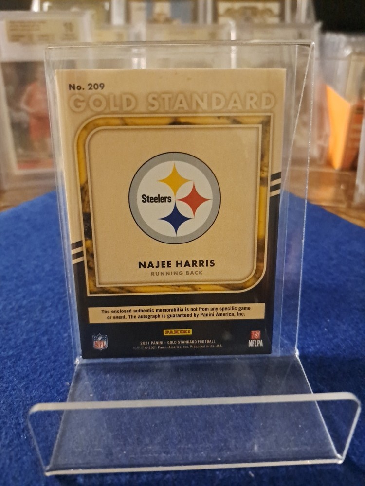Capture a piece of football history with the 2021 Panini Gold Standard Najee Harris rookie card, featuring a coveted jersey/auto combination. With only 149 pieces in existence, this card boasts a low number, 013, making it a sought-after collectible for fans and card enthusiasts alike. Proudly showcasing the Pittsburgh Steelers' rising star, this card is a treasure from the 2021 NFL season. It's a must-have for any collection, bringing a touch of the gridiron glory to your hands. Celebrate Harris's journey and add a gem to your sports memorabilia collection today.
