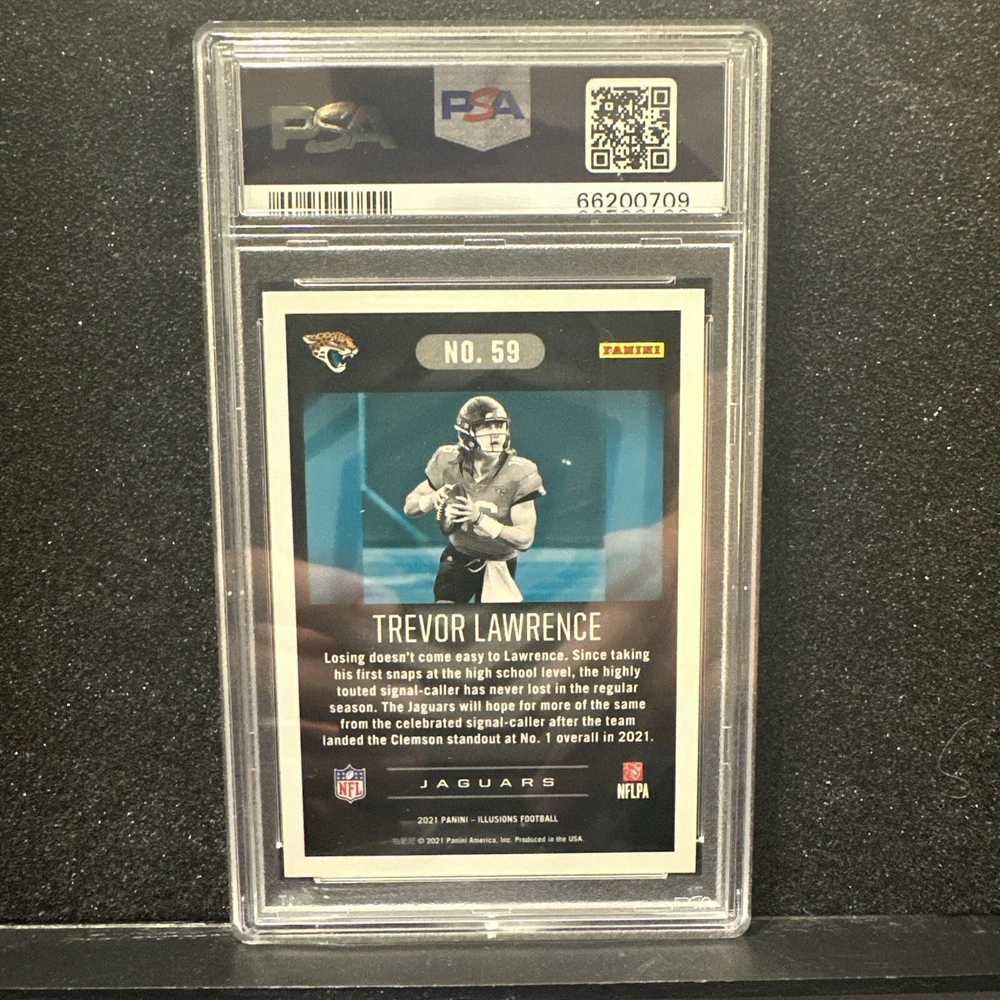 This 2021 Panini Illusions sports trading card features Trevor Lawrence, a rookie player from the National Football League (NFL). The card is part of the Trophy Collection Galaxy parallel/variety and has a card number of 59. It is a great addition to any collection and perfect for fans of football. The card is manufactured by Panini and is part of the base set. It includes features such as the player's name, the league he plays in, and the season. This card is a must-have for any sports trading card collector and is sure to impress.