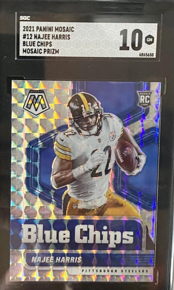 This is a nice example of a 2021 Panini Mosaic #12 Najee Harris Blue Chips Other important information about this card: In 2021 Najee Harris played for the Pittsburgh Steelers. Please check out our other listings for more great cards.