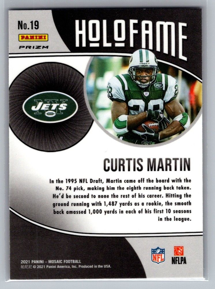2021 Panini Mosaic - Holofame #19 Curtis MartinAll cards are in Excellent condition or better. Some scans may show scratching of the penny sleeve. Please feel free to reach out for additional pictures. Thanks for looking!
