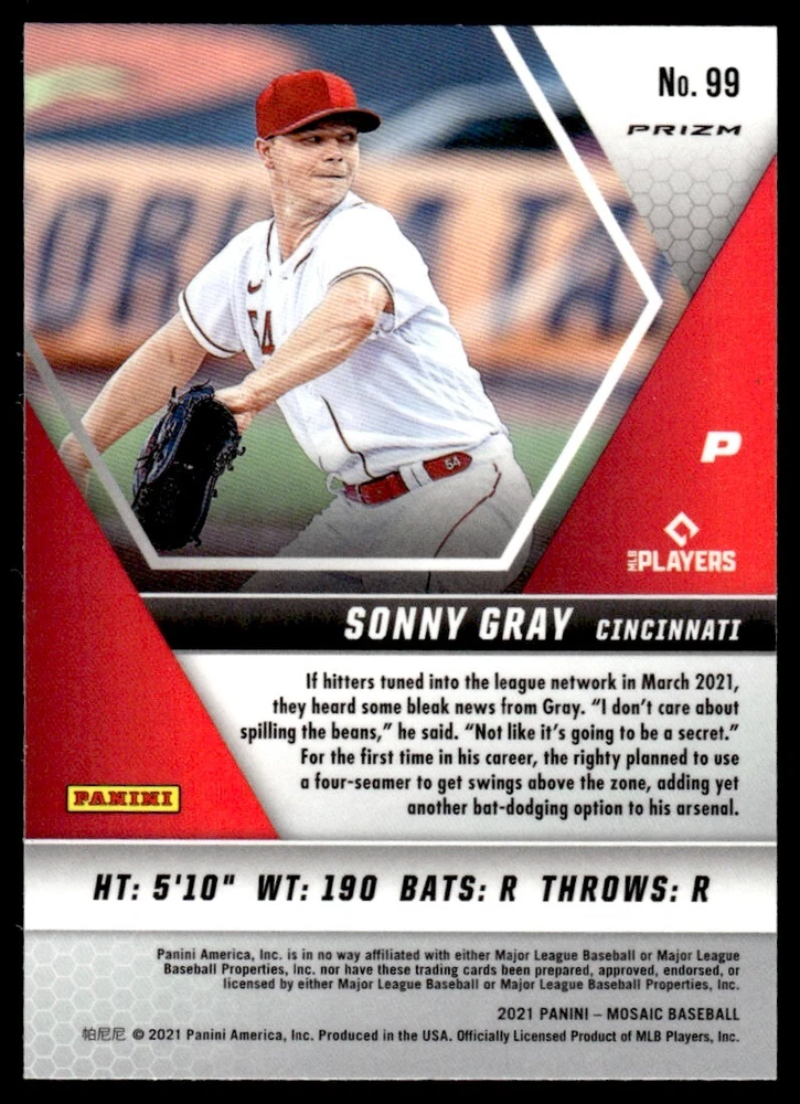 2021 Panini Mosaic Mosaic Green #99 Sonny Gray Front Back Sport: Baseball Set: 2021 Panini Mosaic Mosaic Green Year: 2021 Item#: 99 Player: Sonny Gray Team: Cincinnati Reds Brand: Panini Mosaic Manufacturer: Panini Group Grading Company: Raw Grade SetType: Parallel Item Condition: Near Mint/Mint 2014 Beckett Collectibles, LLC. All Rights Reserved Powered by: Thank you for choosing Burbank Sportscards, the sports cards superstore. We offer a large selection of singles across all sports. Visit our ebay store to view all our items available. Our Shipping Policy We offer Free Standard Shipping to all Domestic customers. Options for Expedited shipping are also available at checkout. For our international customers, shipping is $9.99 for the first item, and $0.25 for each additional item. Note to all customers: To qualify for combines shipping, we ask our customers to add items into the shopping cart. Please note, we do not combine orders that are placed separately. Our Service: Generally, our turnaround is super quick as we process and send out orders same day payment is received. Stock Availability: We do our best to ensure all items are in stock; however, in case of the rare stock out, the customer will have the option for a replacement card, or we will process a refund so the order is not held up. Our Images: Many of our images are stock photos from Beckett archives. They are a representation of the actual card you would receive. If you have any questions regarding the item you're interested in, please feel free to ask (serial numbers and relic pieces may vary) Moreover, in a case of a wrong or defective photo, please notify us, so we can adjust it. Other FAQ's: -When buying multiple cards, do you top load each item? No; however, we do try to insure all items are shipped securely. If you wish to have all of your cards top loaded it is a paid service and can be arranged. Please email for more details. For other questions, please feel free to ask. Thank you.