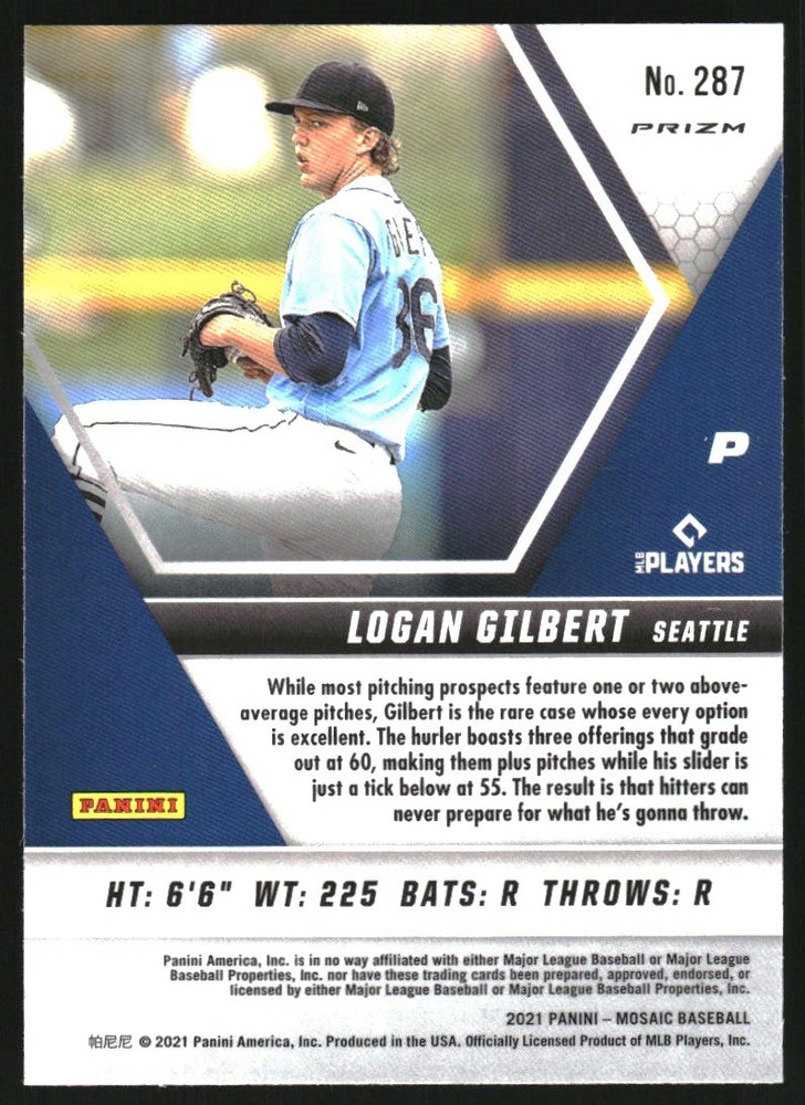 2021 Panini Mosaic Silver Prizm #287 Logan Gilbert Front Back Sport: Baseball Set: 2021 Panini Mosaic Silver Prizm Year: 2021 Item#: 287 Player: Logan Gilbert Team: Seattle Mariners Brand: Panini Mosaic Manufacturer: Panini Group Grading Company: Raw Grade SetType: Parallel Item Condition: Near Mint/Mint 2014 Beckett Collectibles, LLC. All Rights Reserved Powered by: Thank you for choosing Burbank Sportscards, the sports cards superstore. We offer a large selection of singles across all sports. Visit our ebay store to view all our items available. Our Shipping Policy We offer Free Standard Shipping to all Domestic customers. Options for Expedited shipping are also available at checkout. For our international customers, shipping is $9.99 for the first item, and $0.25 for each additional item. Note to all customers: To qualify for combines shipping, we ask our customers to add items into the shopping cart. Please note, we do not combine orders that are placed separately. Our Service: Generally, our turnaround is super quick as we process and send out orders same day payment is received. Stock Availability: We do our best to ensure all items are in stock; however, in case of the rare stock out, the customer will have the option for a replacement card, or we will process a refund so the order is not held up. Our Images: Many of our images are stock photos from Beckett archives. They are a representation of the actual card you would receive. If you have any questions regarding the item you're interested in, please feel free to ask (serial numbers and relic pieces may vary) Moreover, in a case of a wrong or defective photo, please notify us, so we can adjust it. Other FAQ's: -When buying multiple cards, do you top load each item? No; however, we do try to insure all items are shipped securely. If you wish to have all of your cards top loaded it is a paid service and can be arranged. Please email for more details. For other questions, please feel free to ask. Thank you.