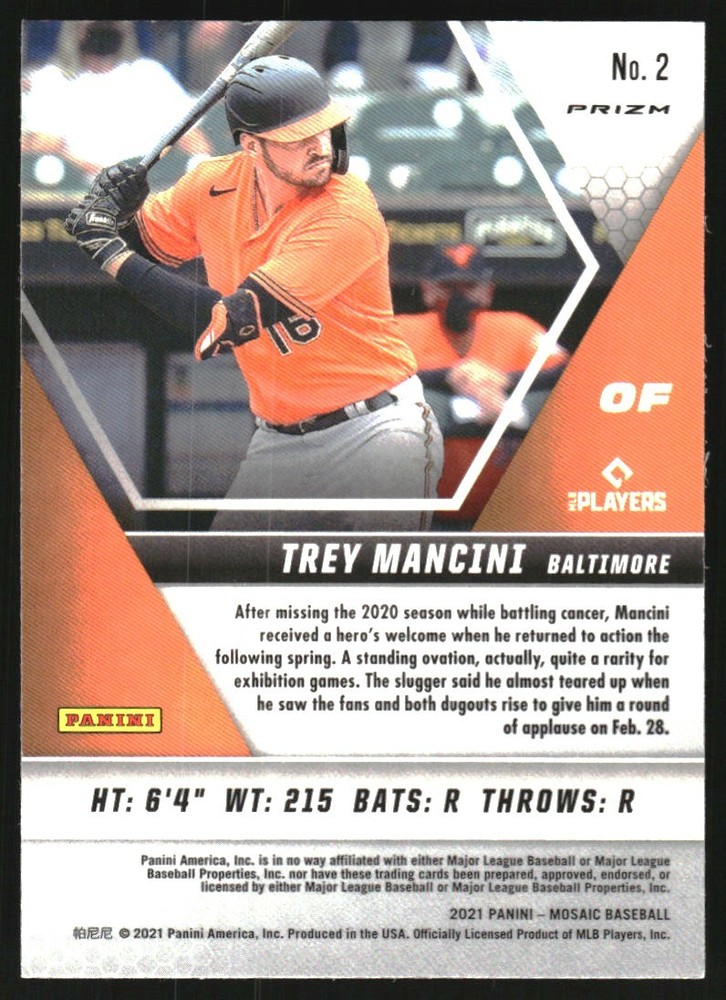 2021 Panini Mosaic Silver Prizm #2 Trey Mancini Front Back Sport: Baseball Set: 2021 Panini Mosaic Silver Prizm Year: 2021 Item#: 2 Player: Trey Mancini Team: Baltimore Orioles Brand: Panini Mosaic Manufacturer: Panini Group Grading Company: Raw Grade SetType: Parallel Item Condition: Near Mint/Mint 2014 Beckett Collectibles, LLC. All Rights Reserved Powered by: Thank you for choosing Burbank Sportscards, the sports cards superstore. We offer a large selection of singles across all sports. Visit our ebay store to view all our items available. Our Shipping Policy We offer Free Standard Shipping to all Domestic customers. Options for Expedited shipping are also available at checkout. For our international customers, shipping is $9.99 for the first item, and $0.25 for each additional item. Note to all customers: To qualify for combines shipping, we ask our customers to add items into the shopping cart. Please note, we do not combine orders that are placed separately. Our Service: Generally, our turnaround is super quick as we process and send out orders same day payment is received. Stock Availability: We do our best to ensure all items are in stock; however, in case of the rare stock out, the customer will have the option for a replacement card, or we will process a refund so the order is not held up. Our Images: Many of our images are stock photos from Beckett archives. They are a representation of the actual card you would receive. If you have any questions regarding the item you're interested in, please feel free to ask (serial numbers and relic pieces may vary) Moreover, in a case of a wrong or defective photo, please notify us, so we can adjust it. Other FAQ's: -When buying multiple cards, do you top load each item? No; however, we do try to insure all items are shipped securely. If you wish to have all of your cards top loaded it is a paid service and can be arranged. Please email for more details. For other questions, please feel free to ask. Thank you.