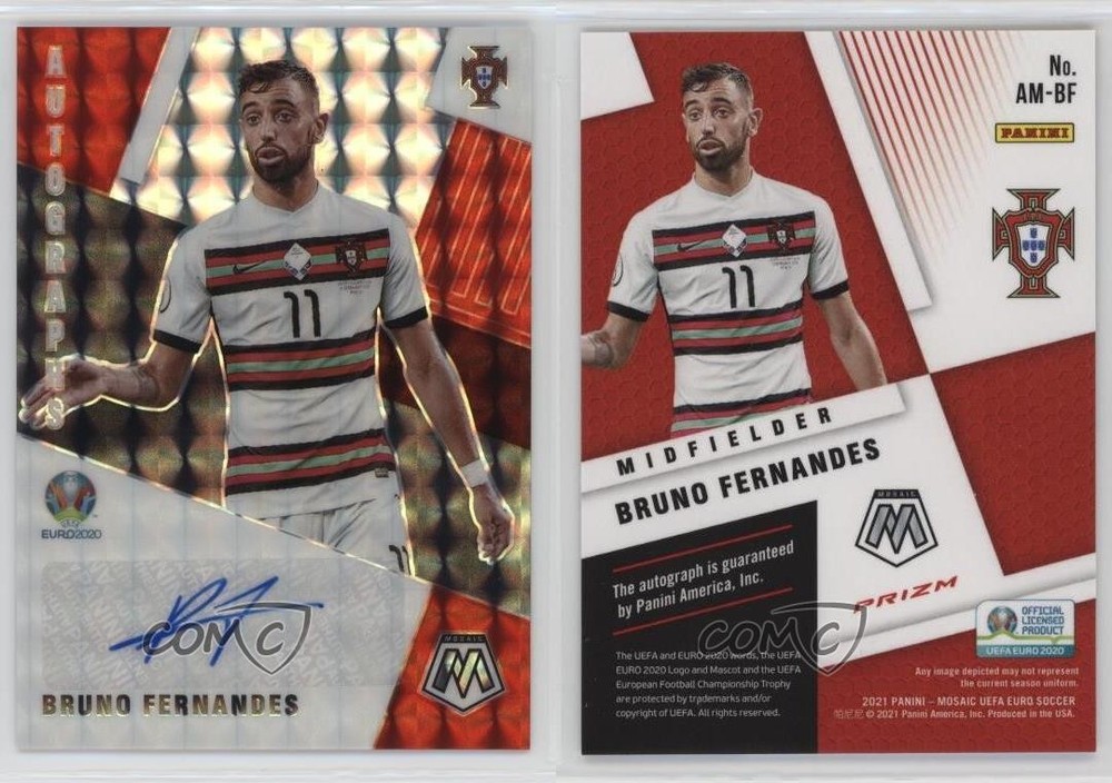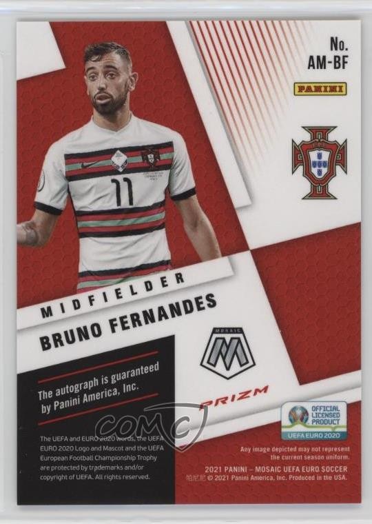 2021 Panini Mosaic UEFA Euro 2020 - Autographs - Silver Mosaic Prizm #AM-BF Bruno Fernandes COMC Item: 265111123 - Soccer Card - Featuring the Portugal - Featuring Bruno Fernandes Search for more: 2021 Panini Mosaic UEFA Euro 2020 Search for more: 2021 Panini Mosaic UEFA Euro 2020 - Autographs - Silver Mosaic Prizm View all of our Listings Auctions Buy It Now About Us Located in the beautiful Pacific Northwest, COMC (Check Out My Cards) is the world's largest consignment service for trading card singles. More than 10,000 people have used our consignment service to list over 50 million trading cards. Find out how we can help you consign your items on eBay by contacting us through eBay messaging. COMC -- "The Safe & Easy Way to Buy & Sell" Raw Condition for Modern Cards Unless otherwise noted, raw modern cards are listed in Near Mint-Mint condition or better. A NM-MT card appears to be Mint at first glance, but upon closer inspection, may exhibit some of the following: minor print defects (e.g. roller marks, print line, dimple), minor scratches, slight edge wear, and slight corner wear. Centering is clearly visible in the images provided and does not factor into our condition assessment. Raw Condition for Vintage Cards Unless otherwise noted, raw vintage cards are listed in Excellent condition or better. An EX card may exhibit some of the following: minor rounding of corners, surface wear, print defects, light scratches, and slight edge wear/chipping. Centering is clearly visible in the images provided and does not factor into our condition assessment. Domestic Shipping Combined shipping for multiple items is available. To receive combined shipping, please ensure all desired items are in your eBay shopping cart before proceeding to checkout. eBay limits orders to 40 items per order. We automatically combine multiple orders placed on the same day. If you place multiple orders on the same day, please contact us to request a refund of applicable shipping costs. Signature confirmation may be required on invoices over $400. All cards are protected and shipped securely. International Shipping COMC offers eBay's International Shipping (EIS) for international orders under $2,500* (see country exceptions below). All duties and import fees are paid at checkout; in the rare event that there are additional import fees upon delivery, these are borne by the buyer. EIS packages route through a shipping hub in Erlanger, KY before shipping to their final destination. Please note that EIS does not allow for combined shipments. The shipping rates are determined by eBay and cannot be adjusted. *Maximum sale price exceptions: Colombia, Kuwait ($2,000); Taiwan ($1,539); Chile, Costa Rica, Guatemala, Honduras, Trinidad and Tobago ($1,000); Antigua and Barbuda, Aruba, Belize, Dominica, Grenada, Philippines, Saint Kitts and Nevis, Saint Lucia, Montserrat, Turks and Caicos Islands ($500); Dominican Republic, El Salvador ($200). Please request a shipping quote through eBay messaging for orders that exceed the maximum sale price supported by eBay's International Shipping. You will be responsible for all duties and import fees for international orders shipped outside the EIS. All cards are protected and shipped securely. Auction Bidding By placing a bid on our auctions, you are making a commitment to complete the purchase. Payment is due within 7 days of winning an auction. Bidders who neglect to pay for an item they win will be blocked from making any future purchases and will be reported to eBay. Payment COMC does not accept offers on our cards through our eBay storefront. COMC utilizes eBay’s managed payments system. If you are experiencing difficulties making a payment, please contact eBay for assistance. Return policy Returns are only accepted on the rare occasion the item is not as described. If you are making a return, please initiate the return process through eBay so a mailing label can be provided for you. Prior to listing, our expert team carefully assessed this item to represent it accurately. Please review the description and high-definition images prior to bidding to ensure this item meets your satisfaction. We welcome you to contact us if you have further questions about this item. Trust and Integrity Shill bidding is prohibited on COMC Auctions. We collaborate with eBay to monitor and identify bidding activity which does not appear to be in good faith. If we determine a bidder is operating outside of eBay’s guidelines, we may choose to cancel their bids, permanently block them from purchasing from COMC, and report them to eBay. Shill bidding is also illegal in many places and can carry severe penalties. COMC carefully assesses each item consigned to us to prevent fraudulent items from entering the marketplace. If you believe an item offered on COMC may be fraudulent, please contact us with details so we can investigate the issue. Items we determine are outside our supported items policy may be removed. Last Modified: 12/1/2025 5:03:39 PM PDT