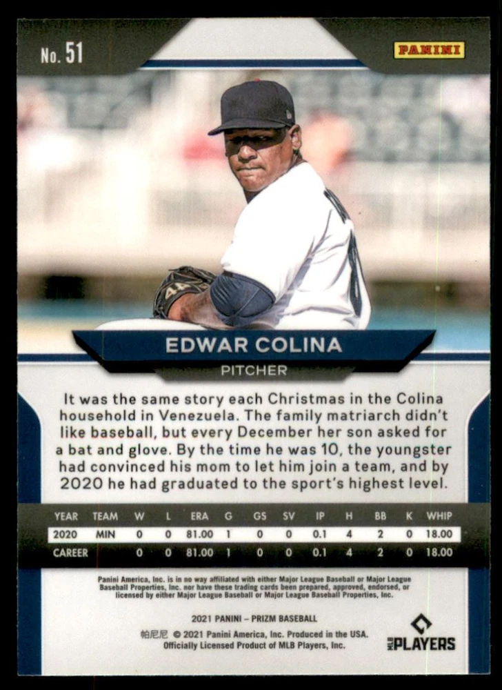 2021 Panini Prizm #51 Edwar Colina Rookie Card Front Back Sport: Baseball Set: 2021 Panini Prizm Year: 2021 Item#: 51 Player: Edwar Colina Team: Minnesota Twins Attributes: Rookie Brand: Panini Prizm Manufacturer: Panini Group Grading Company: Raw Grade SetType: Main Item Condition: Near Mint/Mint 2014 Beckett Collectibles, LLC. All Rights Reserved Powered by: Thank you for choosing Burbank Sportscards, the sports cards superstore. We offer a large selection of singles across all sports. Visit our ebay store to view all our items available. Our Shipping Policy We offer Free Standard Shipping to all Domestic customers. Options for Expedited shipping are also available at checkout. For our international customers, shipping is $9.99 for the first item, and $0.25 for each additional item. Note to all customers: To qualify for combines shipping, we ask our customers to add items into the shopping cart. Please note, we do not combine orders that are placed separately. Our Service: Generally, our turnaround is super quick as we process and send out orders same day payment is received. Stock Availability: We do our best to ensure all items are in stock; however, in case of the rare stock out, the customer will have the option for a replacement card, or we will process a refund so the order is not held up. Our Images: Many of our images are stock photos from Beckett archives. They are a representation of the actual card you would receive. If you have any questions regarding the item you're interested in, please feel free to ask (serial numbers and relic pieces may vary) Moreover, in a case of a wrong or defective photo, please notify us, so we can adjust it. Other FAQ's: -When buying multiple cards, do you top load each item? No; however, we do try to insure all items are shipped securely. If you wish to have all of your cards top loaded it is a paid service and can be arranged. Please email for more details. For other questions, please feel free to ask. Thank you.