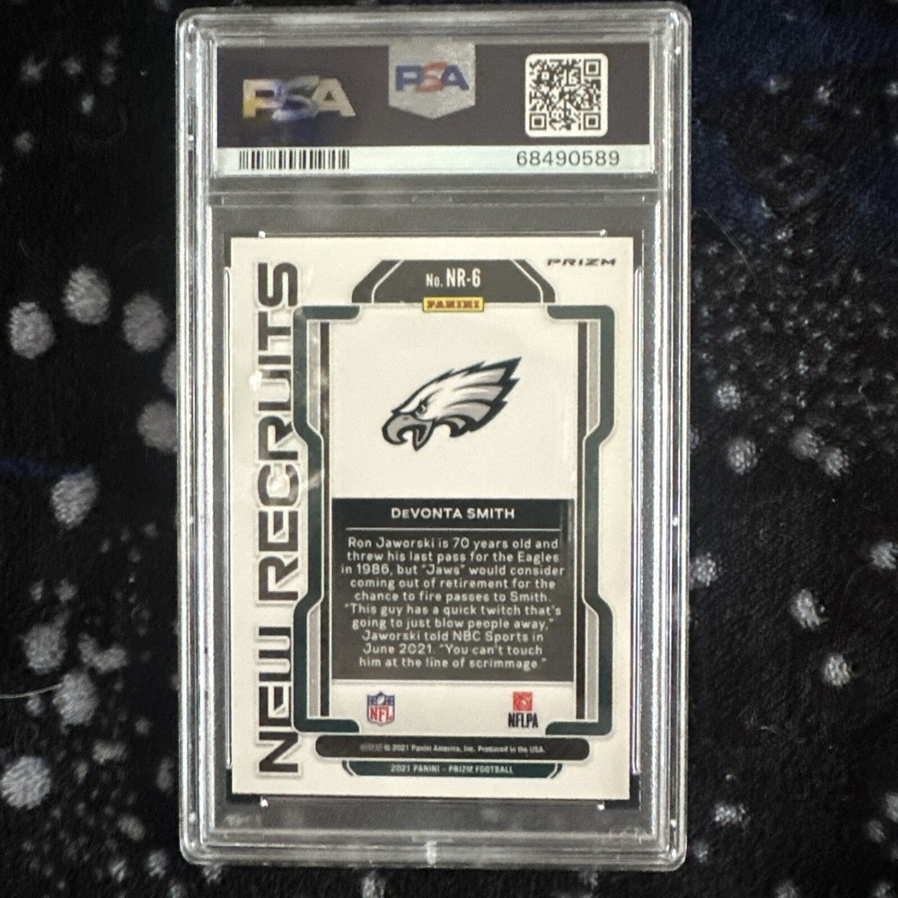 This 2021 Panini Prizm DeVonta Smith RC New Recruits Disco PSA 10 GEM MINT sports trading card is a must-have for any Philadelphia Eagles fan or collector. Featuring the talented rookie wide receiver, this card is sure to be a valuable addition to your collection. With a grade of 10 and the Disco Prizm parallel/variety, this card is a true gem. The card is from the 2021 Panini Prizm set and features Smith in his NFL debut season. As an autographed card with the Professional Sports Authenticator (PSA) grading, you can be assured of its authenticity and quality. Add this card to your collection today and show off your love for football and the Philadelphia Eagles!