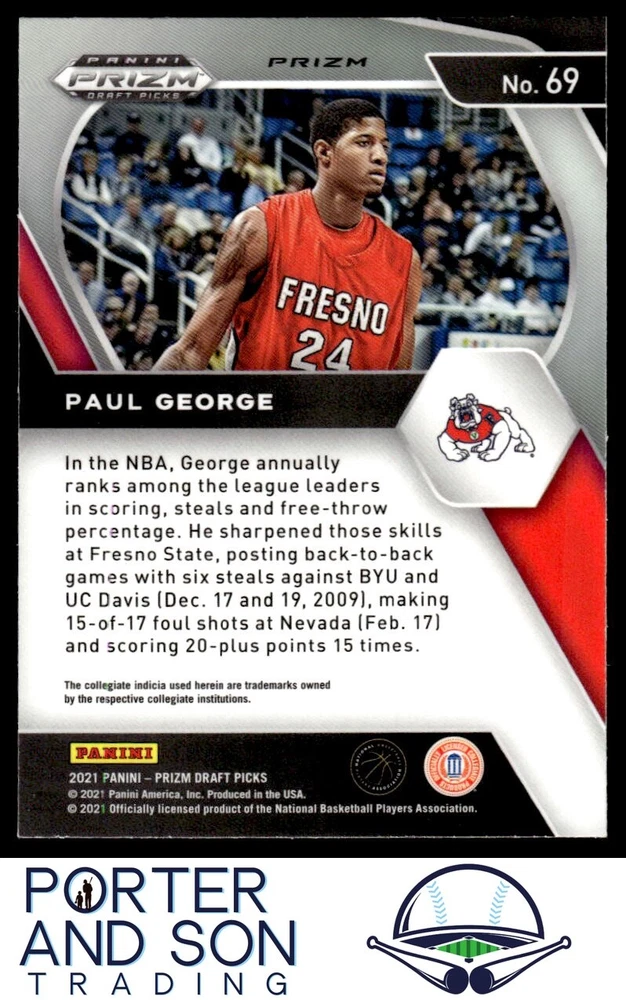 League: NBA Parallel/Variety: Orange Ice Manufacturer: Panini Sport: BASKETBALL Season: 2021 Player/Athlete: Paul George Card Number: 69 Insert Set: Orange Ice Set: 2021 Panini Prizm Draft Picks Team: Fresno State Bulldogs Autographed: No Graded: No Year Manufactured: 2021 Type: Sports Trading Card