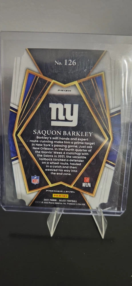 Set: 2021 Panini Select Autographed: No Team: New York Giants Card Number: 126 Sport: Football Manufacturer: Panini Season: 2021 Player/Athlete: Saquon Barkley Year Manufactured: 2021 Parallel/Variety: Red & Blue Prizm Die-Cut Type: Sports Trading Card Features: Parallel/Variety, Base Set League: National Football League (NFL)