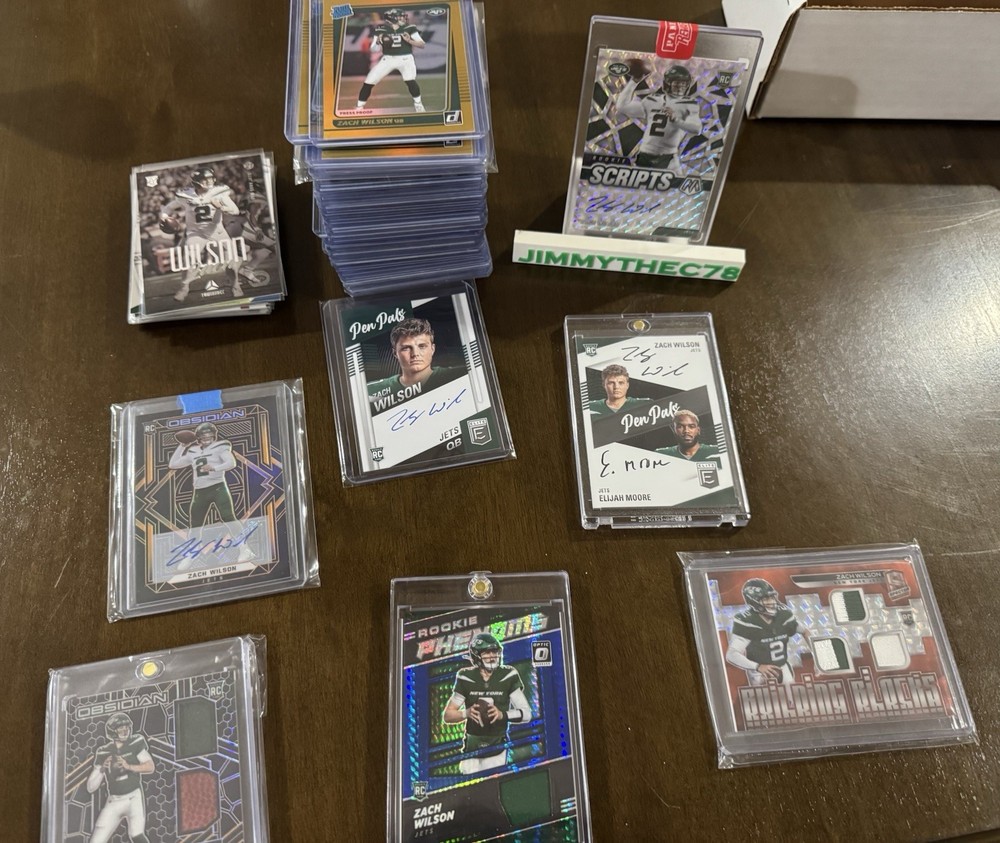 Elevate your collection with the 2021 Panini Zach Wilson Rookie Lot, a treasure trove of autographed and numbered cards, featuring a mix of New York Jets, BYU Cougars, and Miami Dolphins memorabilia. This extensive set includes over all, each showcasing the potential of quarterback Zach Wilson in his rookie season. Highlights include serial numbered inserts, short prints, and a variety of parallels that will impress any NFL enthusiast. Crafted in the United States, each card in this lot is a testament to the quality that Panini is known for. While ungraded, the cards maintain a high standard of preservation, ensuring that they remain a valuable asset for years to come. With original licensing, these cards are the real deal—authentic collectibles for fans and investors alike. ALL CARDS SHIP. Value, Value, Value.