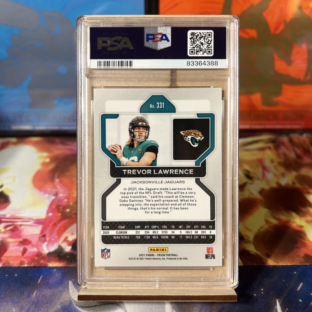 This is a rare and highly sought-after 2021 Panini Prizm sports trading card featuring Trevor Lawrence, the rookie player of the Jacksonville Jaguars in the National Football League (NFL). The card is part of the base set and has a card number of 331. It has been graded by PSA with a grade of 8, ensuring its authenticity and value. This card is perfect for avid collectors of sports trading cards, especially those who are fans of the NFL and the Jacksonville Jaguars. It is a great addition to any collection and is sure to impress. Don't miss out on the opportunity to own this valuable and unique card.