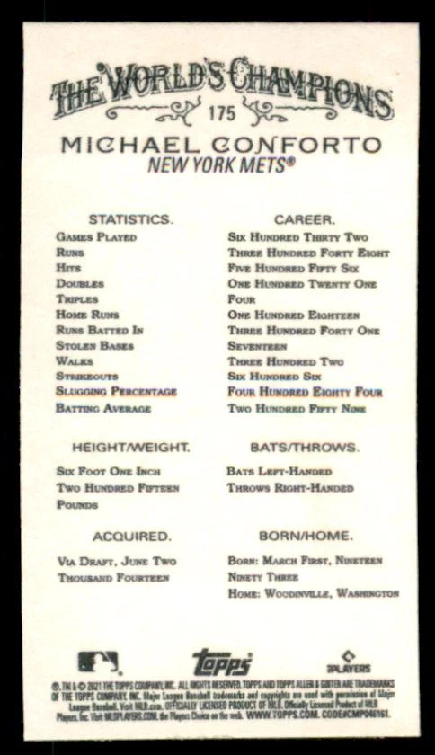 2021 Topps Allen and Ginter Mini Black Border #175 Michael Conforto Front Back Sport: Baseball Set: 2021 Topps Allen and Ginter Mini Black Border Year: 2021 Item#: 175 Player: Michael Conforto Team: New York Mets Brand: Topps Allen and Ginter Manufacturer: Topps Co. Grading Company: Raw Grade SetType: Parallel Item Condition: Near Mint/Mint 2014 Beckett Collectibles, LLC. All Rights Reserved Powered by: Thank you for choosing Burbank Sportscards, the sports cards superstore. We offer a large selection of singles across all sports. Visit our ebay store to view all our items available. Our Shipping Policy We offer Free Standard Shipping to all Domestic customers. Options for Expedited shipping are also available at checkout. For our international customers, shipping is $9.99 for the first item, and $0.25 for each additional item. Note to all customers: To qualify for combines shipping, we ask our customers to add items into the shopping cart. Please note, we do not combine orders that are placed separately. Our Service: Generally, our turnaround is super quick as we process and send out orders same day payment is received. Stock Availability: We do our best to ensure all items are in stock; however, in case of the rare stock out, the customer will have the option for a replacement card, or we will process a refund so the order is not held up. Our Images: Many of our images are stock photos from Beckett archives. They are a representation of the actual card you would receive. If you have any questions regarding the item you're interested in, please feel free to ask (serial numbers and relic pieces may vary) Moreover, in a case of a wrong or defective photo, please notify us, so we can adjust it. Other FAQ's: -When buying multiple cards, do you top load each item? No; however, we do try to insure all items are shipped securely. If you wish to have all of your cards top loaded it is a paid service and can be arranged. Please email for more details. For other questions, please feel free to ask. Thank you.