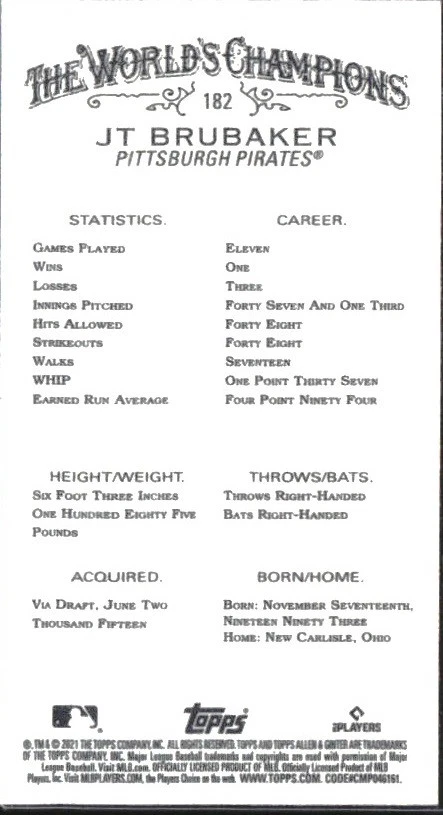 2021 Topps Allen and Ginter Mini Black Border #182 JT Brubaker Front Back Sport: Baseball Set: 2021 Topps Allen and Ginter Mini Black Border Year: 2021 Item#: 182 Player: JT Brubaker Team: Pittsburgh Pirates Brand: Topps Allen and Ginter Manufacturer: Topps Co. Grading Company: Raw Grade SetType: Parallel Item Condition: Near Mint/Mint 2014 Beckett Collectibles, LLC. All Rights Reserved Powered by: Thank you for choosing Burbank Sportscards, the sports cards superstore. We offer a large selection of singles across all sports. Visit our ebay store to view all our items available. Our Shipping Policy We offer Free Standard Shipping to all Domestic customers. Options for Expedited shipping are also available at checkout. For our international customers, shipping is $9.99 for the first item, and $0.25 for each additional item. Note to all customers: To qualify for combines shipping, we ask our customers to add items into the shopping cart. Please note, we do not combine orders that are placed separately. Our Service: Generally, our turnaround is super quick as we process and send out orders same day payment is received. Stock Availability: We do our best to ensure all items are in stock; however, in case of the rare stock out, the customer will have the option for a replacement card, or we will process a refund so the order is not held up. Our Images: Many of our images are stock photos from Beckett archives. They are a representation of the actual card you would receive. If you have any questions regarding the item you're interested in, please feel free to ask (serial numbers and relic pieces may vary) Moreover, in a case of a wrong or defective photo, please notify us, so we can adjust it. Other FAQ's: -When buying multiple cards, do you top load each item? No; however, we do try to insure all items are shipped securely. If you wish to have all of your cards top loaded it is a paid service and can be arranged. Please email for more details. For other questions, please feel free to ask. Thank you.