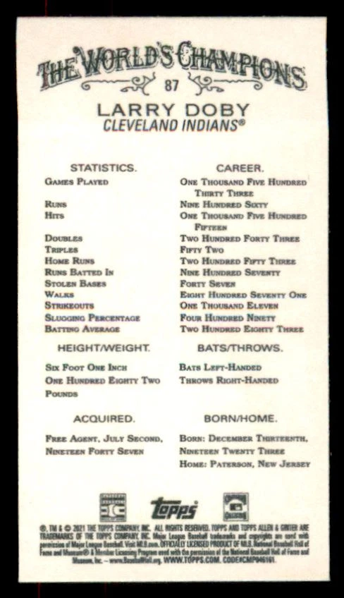 2021 Topps Allen and Ginter Mini Black Border Indians Baseball #87 Larry Doby Front Back Sport: Baseball Set: 2021 Topps Allen and Ginter Mini Black Border Year: 2021 Item#: 87 Player: Larry Doby Team: Cleveland Indians Brand: Topps Allen and Ginter Manufacturer: Topps Co. Grading Company: Raw Grade SetType: Parallel Item Condition: Near Mint/Mint 2014 Beckett Collectibles, LLC. All Rights Reserved Powered by: Thank you for choosing Burbank Sportscards, the sports cards superstore. We offer a large selection of singles across all sports. Visit our ebay store to view all our items available. Our Shipping Policy We offer Free Standard Shipping to all Domestic customers. Options for Expedited shipping are also available at checkout. For our international customers, shipping is $9.99 for the first item, and $0.25 for each additional item. Note to all customers: To qualify for combines shipping, we ask our customers to add items into the shopping cart. Please note, we do not combine orders that are placed separately. Our Service: Generally, our turnaround is super quick as we process and send out orders same day payment is received. Stock Availability: We do our best to ensure all items are in stock; however, in case of the rare stock out, the customer will have the option for a replacement card, or we will process a refund so the order is not held up. Our Images: Many of our images are stock photos from Beckett archives. They are a representation of the actual card you would receive. If you have any questions regarding the item you're interested in, please feel free to ask (serial numbers and relic pieces may vary) Moreover, in a case of a wrong or defective photo, please notify us, so we can adjust it. Other FAQ's: -When buying multiple cards, do you top load each item? No; however, we do try to insure all items are shipped securely. If you wish to have all of your cards top loaded it is a paid service and can be arranged. Please email for more details. For other questions, please feel free to ask. Thank you.
