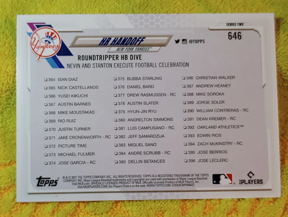 DO-IT-RIGHT-COLLECTABLES Card is in Near Mint condition Same Day shipping Returns accepted Thanks! This is a 2021 Topps sports trading card featuring New York Yankees players Giancarlo Stanton and Phil Nevin. The card is part of the Base Set, with card number 646. It is in NEAR MINT condition. The card is from Major League Baseball (MLB) and manufactured by Topps. It is a single card in the Sports Trading Cards category.